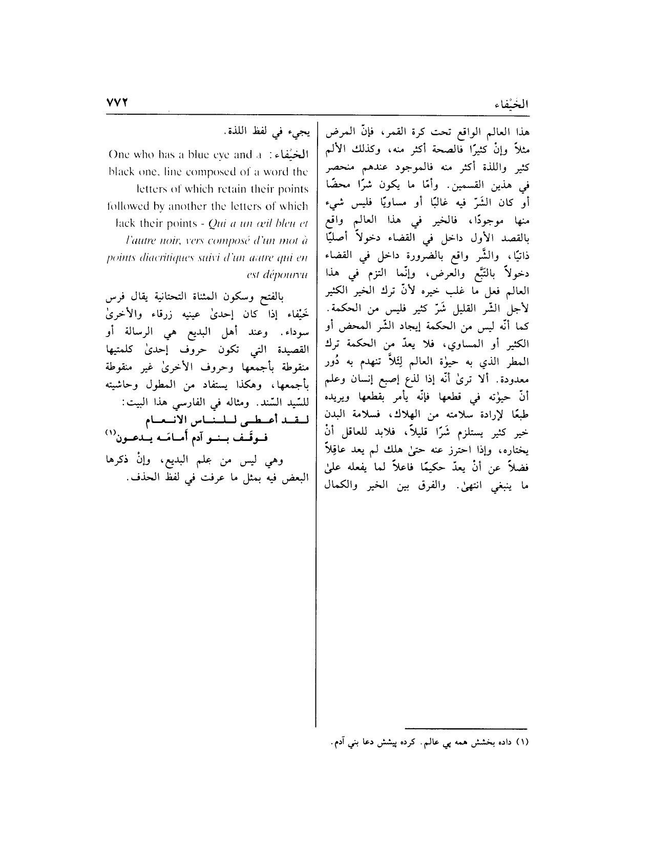 بالفتح وسكون المثناة التحتانية يقال فرس خيفاء إذا كان إحدى عينيه زرقاء والأخرى سوداء. وعند أهل البديع هي الرسالة أو القصيدة التي تكون حروف إحدى كلمتيها منقوطة بأجمعها وحروف الأخرى غير منقوطة بأجمعها، وهكذا يستفاد من المطول وحاشيته للسّيد السّند. ومثاله في الفارسي هذا البيت: