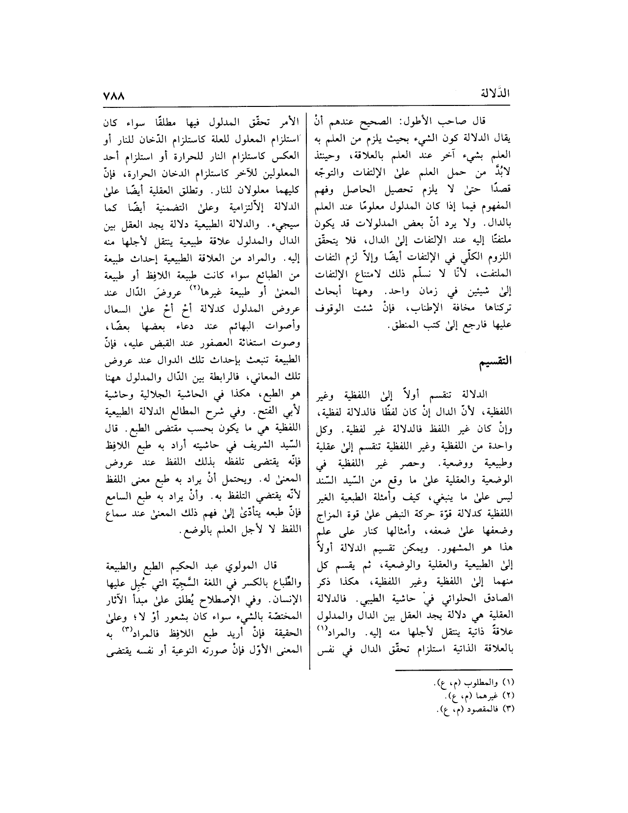 قال صاحب الأطول: الصحيح عندهم أن يقال الدلالة كون الشيء بحيث يلزم من العلم به العلم بشيء آخر عند العلم بالعلاقة، وحينئذ لا بدّ من حمل العلم على الالتفات والتوجّه قصدا حتى لا يلزم تحصيل الحاصل وفهم المفهوم فيما إذا كان المدلول معلوما عند العلم بالدال. ولا يرد أنّ بعض المدلولات قد يكون ملتفتا إليه عند الالتفات إلى الدال، فلا يتحقّق اللزوم الكلّي في الالتفات أيضا وإلّا لزم التفات الملتفت، لأنّا لا نسلّم ذلك لامتناع الالتفات إلى شيئين في زمان واحد. وهاهنا أبحاث تركناها مخافة الإطناب، فإن شئت الوقوف عليها فارجع إلى كتب المنطق.