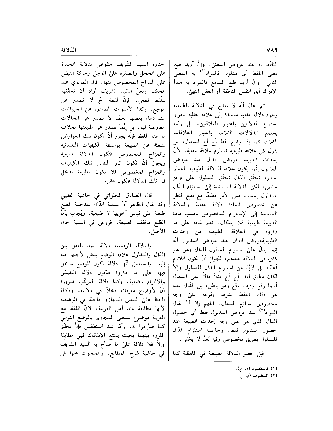 ثم اعلم أنّه لا يقدح في الدلالة الطبيعية وجود دلالة عقلية مستندة إلى علاقة عقلية لجواز اجتماع الدلالتين باعتبار العلاقتين، بل ربّما يجتمع الدلالات الثلاث باعتبار العلاقات الثلاث كما إذا وضع لفظ أح أح للسعال، بل نقول كل علاقة طبيعية تستلزم علاقة عقلية، لأنّ إحداث الطبيعة عروض الدال عند عروض المدلول إنّما يكون علاقة للدلالة الطبيعية باعتبار استلزم تحقّق الدّال تحقّق المدلول على وجه خاص، لكن الدلالة المستندة إلى استلزام الدّال للمدلول بحسب نفس الأمر مطلقا مع قطع النظر عن خصوص المادة دلالة عقلية والدلالة المستندة إلى الاستلزام المخصوص بحسب مادة الطبيعة طبيعية فلا إشكال. نعم يتّجه على ما ذكروه في العلاقة الطبيعية من إحداث الطبيعية عروض الدّال عند عروض المدلول أنّه إنما يدلّ على استلزام المدلول للدّال وهو غير كاف في الدلالة عندهم، لجواز أن يكون اللازم أعمّ، بل لا بدّ من استلزام الدال للمدلول وإلّا لكان مطلق لفظ أح أح مثلا دالا على السعال أينما وقع وكيف وقع وهو باطل، بل الدّال عليه هو ذلك اللفظ بشرط وقوعه على وجه مخصوص يستلزم السعال. اللهم إلّا أن يقال المراد «2» عند عروض المدلول فقط أي حصول الدال الذي هو على وجه إحداث الطبيعة عند حصول المدلول فقط. وحاصله استلزام الدّال للمدلول بطريق مخصوص وفيه بعد لا يخفى.