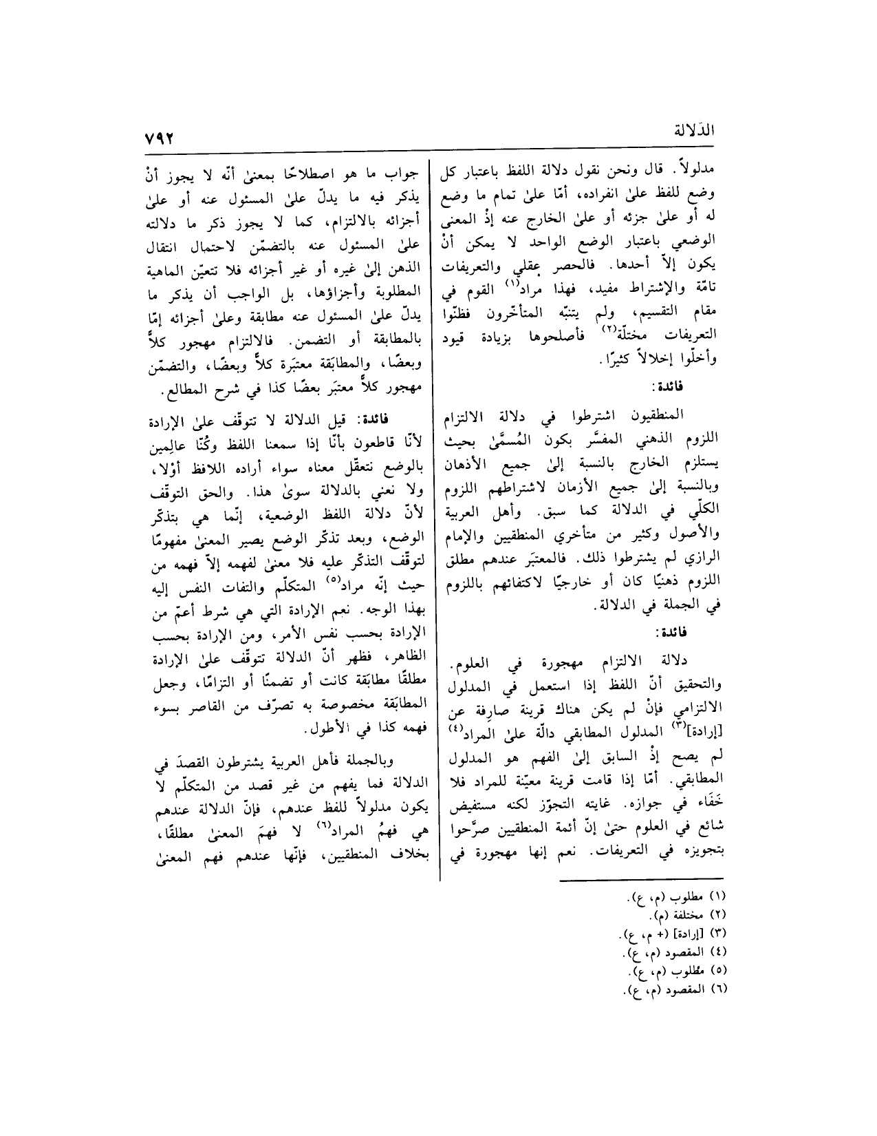 وبالجملة فأهل العربية يشترطون القصد في الدلالة فما يفهم من غير قصد من المتكلّم لا يكون مدلولا للفظ عندهم، فإنّ الدلالة عندهم هي فهم المراد «6» لا فهم المعنى مطلقا، بخلاف المنطقيين، فإنّها عندهم فهم المعنى