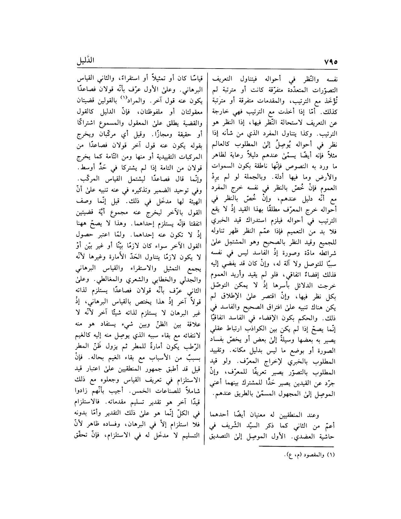 نفسه والنّظر في أحواله فيتناول التعريف التصوّرات المتعدّدة متفرّقة كانت أو مترتبة لم تؤخذ مع الترتيب، والمقدمات متفرقة أو مترتبة كذلك. أمّا إذا أخذت مع الترتيب فهي خارجة عن التعريف لاستحالة النّظر فيها، إذا النظر هو الترتيب. وكذا يتناول المفرد الذي من شأنه إذا نظر في أحواله يوصل إلى المطلوب كالعالم مثلا فإنه أيضا يسمّى عندهم دليلا رعاية لظاهر ما ورد به النصوص فإنّها ناطقة بكون السموات والأرض وما فيها أدلة. وبالجملة لو لم يرد العموم فإن خصّ بالنظر في نفسه خرج المفرد مع أنّه دليل عندهم، وإن خصّ بالنظر في أحواله خرج المعرّف مطلقا بهذا القيد إذ لا يقع الترتيب في أحواله فيلزم استدراك قيد الخبري فلا بد من التعميم فإذا عمّم النظر ظهر تناوله للجميع وقيد النظر بالصحيح وهو المشتمل على شرائطه مادّة وصورة إذ الفاسد ليس في نفسه سببا للتوصل ولا آلة له، وإن كان قد يفضي إليه فذلك إفضاء اتفاقي، فلو لم يقيد وأريد العموم خرجت الدلائل بأسرها إذ لا يمكن التوصّل بكل نظر فيها، وإن اقتصر على الإطلاق لم يكن هناك تنبيه على افتراق الصحيح والفاسد في ذلك. والحكم بكون الإفضاء في الفاسد اتفاقيا إنّما يصحّ إذا لم يكن بين الكواذب ارتباط عقلي يصير به بعضها وسيلة إلى بعض أو يخصّ بفساد الصورة أو بوضع ما ليس بدليل مكانه. وتقييد المطلوب بالخبري لإخراج المعرّف. ولو قيد المطلوب بالتصوّر يصير تعريفا للمعرّف، وإن جرّد عن القيدين يصير حدّا للمشترك بينهما أعني الموصل إلى المجهول المسمّى بالطريق عندهم.
