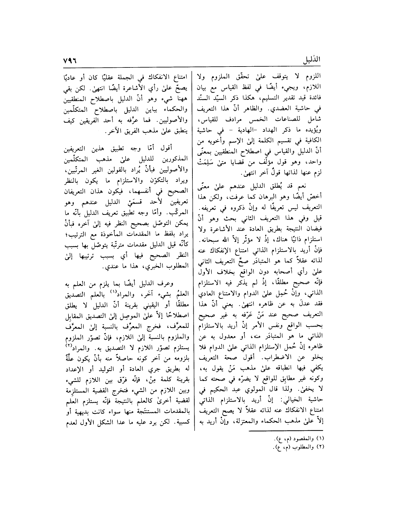 فإن أريد بالاستلزام الذاتي امتناع الانفكاك عنه لذاته عقلا كما هو المتبادر صحّ التعريف الثاني على رأي أصحابه دون الواقع بخلاف الأول فإنّه صحيح مطلقا، إذ لم يذكر فيه الاستلزام الذاتي، وإن حمل على الدوام والامتناع العادي فقد عدل به عن ظاهره انتهى. يعني أنّ هذا التعريف صحيح عند من عرّفه به غير صحيح بحسب الواقع ونفس الأمر إن أريد بالاستلزام الذاتي ما هو المتبادر منه، أو معدول به عن ظاهره إن حمل الاستلزام الذاتي على الدوام فلا يخلو عن الاضطراب. أقول صحة التعريف يكفي فيها انطباقه على مذهب من يقول به، وكونه غير مطابق للواقع لا يضرّه في صحته كما لا يخفى. ولذا قال المولوي عبد الحكيم في حاشية الخيالي: إن أريد بالاستلزام الذاتي امتناع الانفكاك عنه لذاته عقلا لا يصح التعريف إلّا على مذهب الحكماء والمعتزلة، وإن أريد به امتناع الانفكاك في الجملة عقليا كان أو عاديا يصحّ على رأي الأشاعرة أيضا انتهى. لكن بقي هاهنا شيء وهو أنّ الدليل باصطلاح المنطقيين والحكماء يباين الدليل باصطلاح المتكلّمين والأصوليين. فما عرّفه به أحد الفريقين كيف ينطبق على مذهب الفريق الآخر.