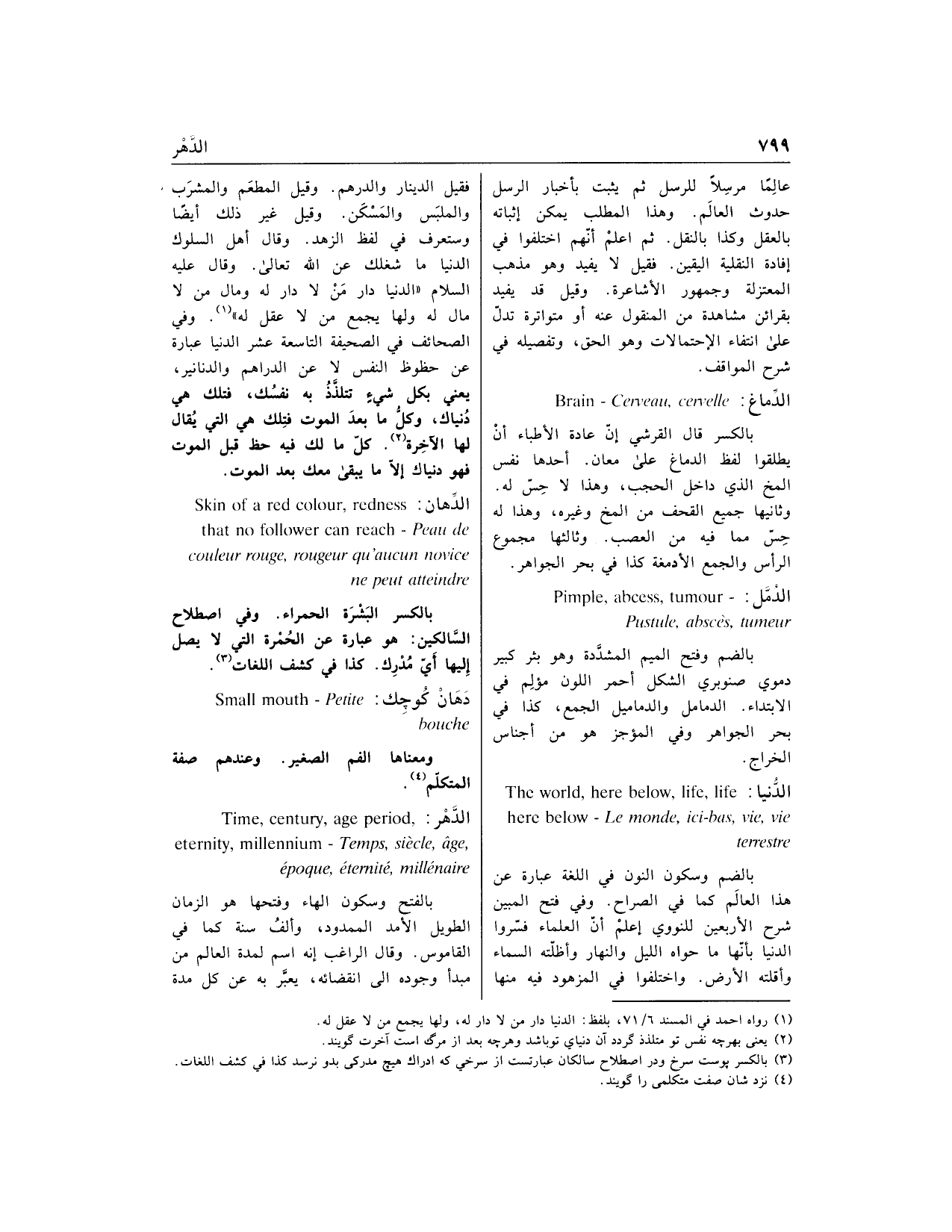بالكسر قال القرشي إنّ عادة الأطباء أن يطلقوا لفظ الدماغ على معان. أحدها نفس المخ الذي داخل الحجب، وهذا لا حسّ له.