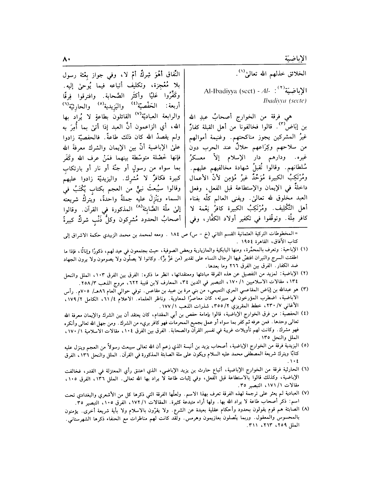 (2) الإباضية: لمزيد من التفصيل عن هذه الفرقة مبادئها ومعتقداتها، انظر ما ذكره: الفرق بين الفرق 103، الملل والنحل 134، مقالات الاسلاميين 1/ 170، التبصير في الدين 34، المعارف لابن قتيبة 622، مروج الذهب 3/ 258.