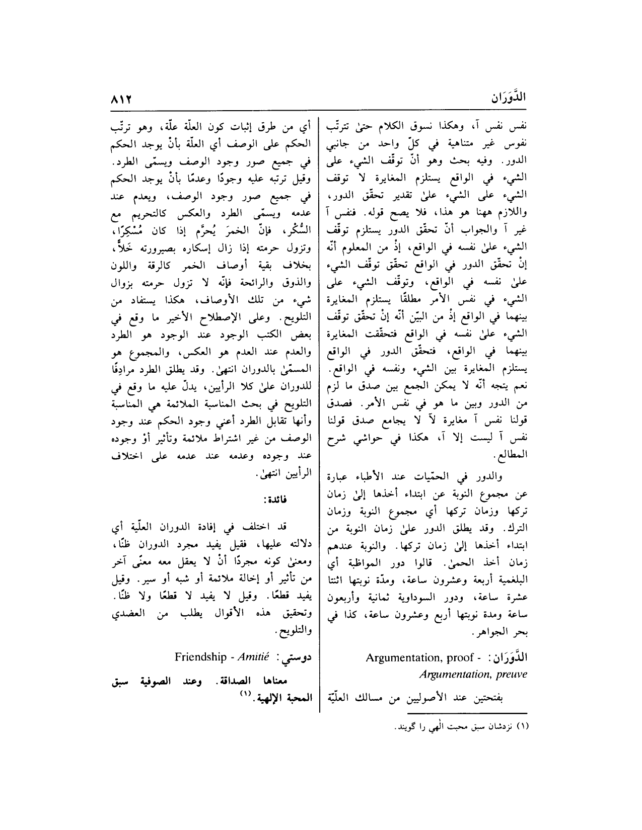 وقيل ترتبه عليه وجودا وعدما بأن يوجد الحكم في جميع صور وجود الوصف، ويعدم عند عدمه ويسمّى الطرد والعكس كالتحريم مع السّكر، فإنّ الخمر يحرّم إذا كان مسكرا، وتزول حرمته إذا زال إسكاره بصيرورته خلًّا، بخلاف بقية أوصاف الخمر كالرقة واللون والذوق والرائحة فإنّه لا تزول حرمته بزوال شيء من تلك الأوصاف، هكذا يستفاد من التلويح. وعلى الاصطلاح الأخير ما وقع في بعض الكتب الوجود عند الوجود هو الطرد والعدم عند العدم هو العكس، والمجموع هو المسمّى بالدوران انتهى. وقد يطلق الطرد مرادفا للدوران على كلا الرأيين، يدلّ عليه ما وقع في التلويح في بحث المناسبة الملائمة هي المناسبة وأنها تقابل الطرد أعني وجود الحكم عند وجود الوصف من غير اشتراط ملائمة وتأثير أو وجوده عند وجوده وعدمه عند عدمه على اختلاف الرأيين انتهى.