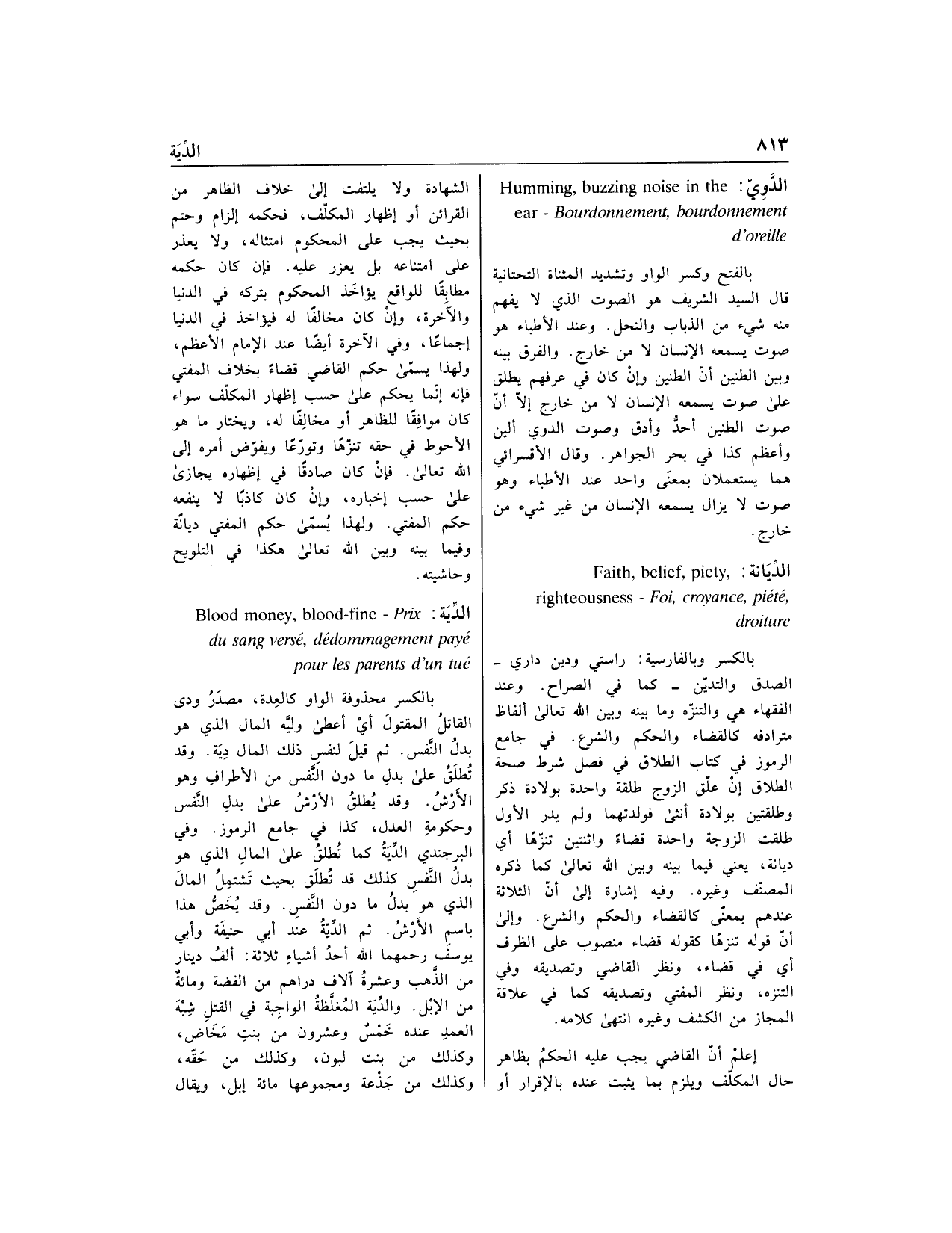بالكسر محذوفة الواو كالعدة، مصدر ودى القاتل المقتول أي أعطى وليّه المال الذي هو بدل النّفس. ثم قيل لنفس ذلك المال دية. وقد تطلق على بدل ما دون النّفس من الأطراف وهو الأرش. وقد يطلق الأرش على بدل النّفس وحكومة العدل، كذا في جامع الرموز. وفي البرجندي الدّية كما تطلق على المال الذي هو بدل النّفس كذلك قد تطلق بحيث تشتمل المال الذي هو بدل ما دون النّفس. وقد يخصّ هذا باسم الأرش. ثم الدّية عند أبي حنيفة وأبي يوسف رحمهما الله أحد أشياء ثلاثة: ألف دينار من الذّهب وعشرة آلاف دراهم من الفضة ومائة من الإبل. والدّية المغلّظة الواجبة في القتل شبه العمد عنده خمس وعشرون من بنت مخاض، وكذلك من بنت لبون، وكذلك من حقّه، وكذلك من جذعة ومجموعها مائة إبل، ويقال