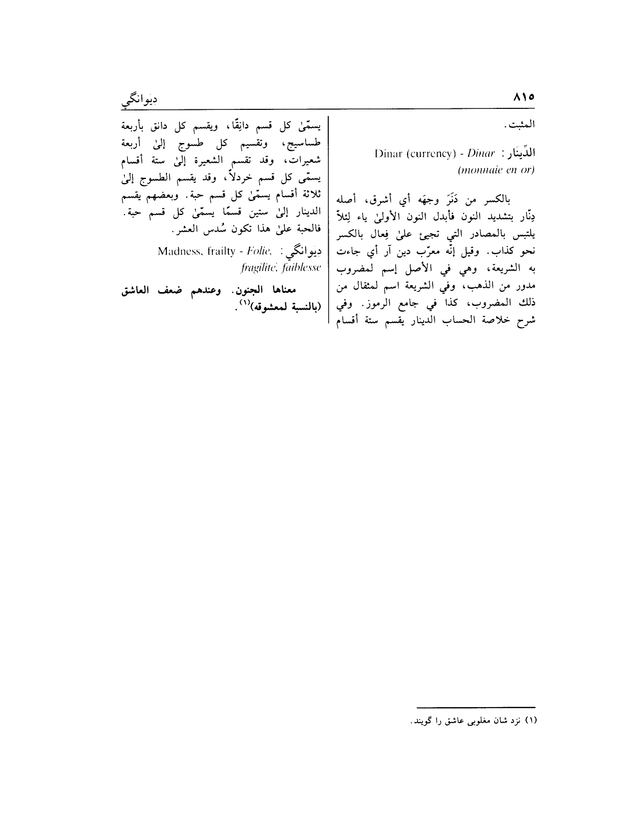 بالكسر من دنر وجهه أي أشرق، أصله دنّار بتشديد النون فأبدل النون الأولى ياء لئلّا يلتبس بالمصادر التي تجيء على فعال بالكسر نحو كذاب. وقيل إنّه معرّب دين آر أي جاءت به الشريعة، وهي في الأصل اسم لمضروب مدور من الذهب، وفي الشريعة اسم لمثقال من ذلك المضروب، كذا في جامع الرموز. وفي شرح خلاصة الحساب الدينار يقسم ستة أقسام يسمّى كل قسم دانقا، ويقسم كل دانق بأربعة طساسيج، وتقسيم كل طسوج إلى أربعة شعيرات، وقد تقسم الشعيرة إلى ستة أقسام يسمّى كل قسم خردلا، وقد يقسم الطسوج إلى ثلاثة أقسام يسمّى كل قسم حبة. وبعضهم يقسم الدينار إلى ستين قسما يسمّى كل قسم حبة.