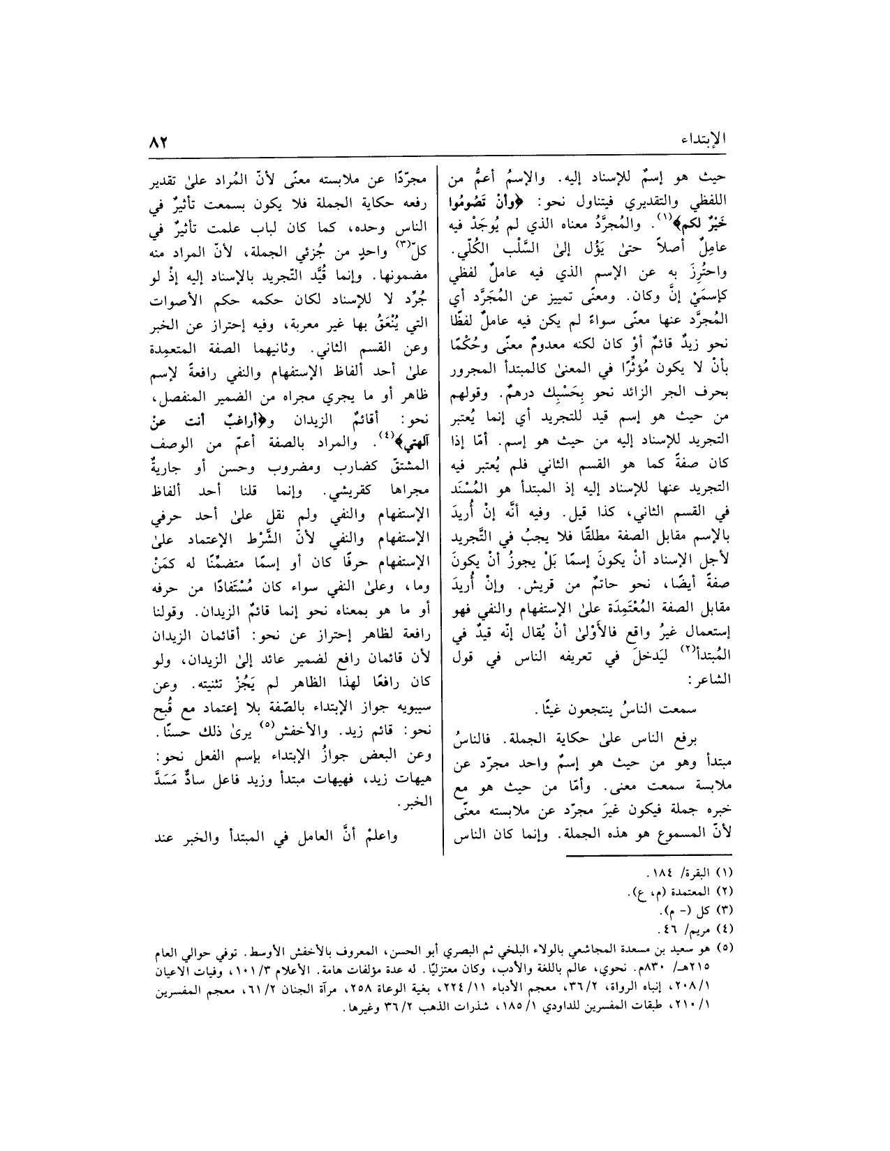 برفع الناس على حكاية الجملة. فالناس مبتدأ وهو من حيث هو اسم واحد مجرّد عن ملابسة سمعت معنى. وأمّا من حيث هو مع خبره جملة فيكون غير مجرّد عن ملابسته معنى لأنّ المسموع هو هذه الجملة. وإنما كان الناس مجرّدا عن ملابسته معنى لأنّ المراد على تقدير رفعه حكاية الجملة فلا يكون بسمعت تأثير في الناس وحده، كما كان لباب علمت تأثير في كلّ «3» واحد من جزئي الجملة، لأنّ المراد منه مضمونها. وإنما قيّد التّجريد بالإسناد إليه إذ لو جرّد لا للإسناد لكان حكمه حكم الأصوات التي ينعق بها غير معربة، وفيه احتراز عن الخبر وعن القسم الثاني. وثانيهما الصفة المتعمدة على أحد ألفاظ الاستفهام والنفي رافعة لاسم ظاهر أو ما يجري مجراه من الضمير المنفصل، نحو: أقائم الزيدان وأَ راغِبٌ أَنْتَ عَنْ آلِهَتِي «4». والمراد بالصفة أعمّ من الوصف المشتقّ كضارب ومضروب وحسن أو جارية مجراها كقريشي. وإنما قلنا أحد ألفاظ الاستفهام والنفي ولم نقل على أحد حرفي الاستفهام والنفي لأنّ الشّرط الاعتماد على الاستفهام حرفا كان أو اسما متضمّنا له كمن وما، وعلى النفي سواء كان مستفادا من حرفه أو ما هو بمعناه نحو إنما قائم الزيدان. وقولنا رافعة لظاهر احتراز عن نحو: أقائمان الزيدان لأن قائمان رافع لضمير عائد إلى الزيدان، ولو كان رافعا لهذا الظاهر لم يجز تثنيته. وعن سيبويه جواز الابتداء بالصّفة بلا اعتماد مع قبح نحو: قائم زيد. والأخفش «5» يرى ذلك حسنا.