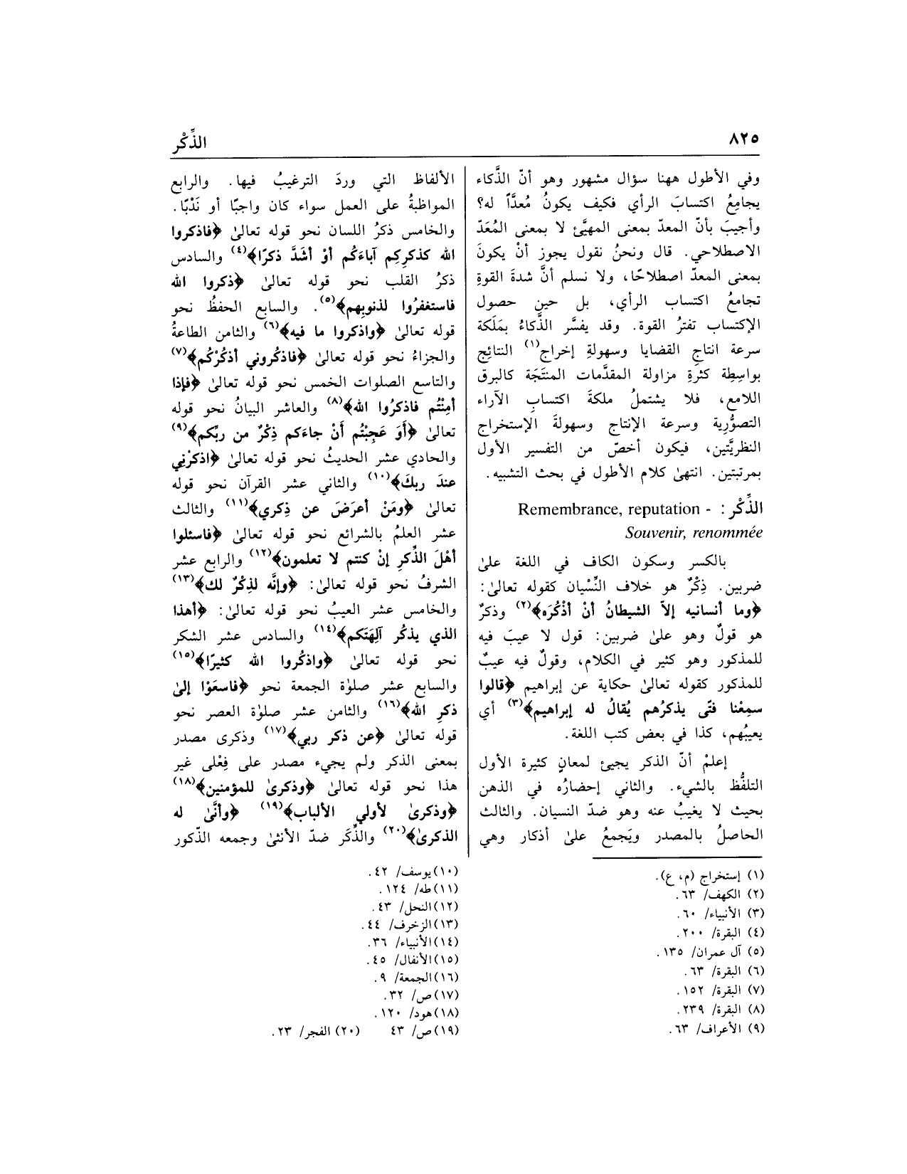 والخامس ذكر اللسان نحو قوله تعالى فَاذْكُرُوا اللَّهَ كَذِكْرِكُمْ آباءَكُمْ أَوْ أَشَدَّ ذِكْراً «4» والسادس ذكر القلب نحو قوله تعالى ذَكَرُوا اللَّهَ فَاسْتَغْفَرُوا لِذُنُوبِهِمْ «5». والسابع الحفظ نحو قوله تعالى وَاذْكُرُوا ما فِيهِ «6» والثامن الطاعة والجزاء نحو قوله تعالى فَاذْكُرُونِي أَذْكُرْكُمْ «7» والتاسع الصلوات الخمس نحو قوله تعالى فَإِذا أَمِنْتُمْ فَاذْكُرُوا اللَّهَ «8» والعاشر البيان نحو قوله تعالى أَوَعَجِبْتُمْ أَنْ جاءَكُمْ ذِكْرٌ مِنْ رَبِّكُمْ «9» والحادي عشر الحديث نحو قوله تعالى اذْكُرْنِي عِنْدَ رَبِّكَ «10» والثاني عشر القرآن نحو قوله تعالى وَمَنْ أَعْرَضَ عَنْ ذِكْرِي «11» والثالث عشر العلم بالشرائع نحو قوله تعالى فَسْئَلُوا أَهْلَ الذِّكْرِ إِنْ كُنْتُمْ لا تَعْلَمُونَ «12» والرابع عشر الشرف نحو قوله تعالى: وَإِنَّهُ لَذِكْرٌ لَكَ «13» والخامس عشر العيب نحو قوله تعالى: أَهذَا الَّذِي يَذْكُرُ آلِهَتَكُمْ «14» والسادس عشر الشكر نحو قوله تعالى وَاذْكُرُوا اللَّهَ كَثِيراً «15» والسابع عشر صلاة الجمعة نحو فَاسْعَوْا إِلى ذِكْرِ اللَّهِ «16» والثامن عشر صلاة العصر نحو قوله تعالى عَنْ ذِكْرِ رَبِّي «17» وذكرى مصدر بمعنى الذكر ولم يجيء مصدر على فعلى غير هذا نحو قوله تعالى وَذِكْرى لِلْمُؤْمِنِينَ «18» وَذِكْرى لِأُولِي الْأَلْبابِ «19» وَأَنَّى لَهُ الذِّكْرى «20» والذّكر ضدّ الأنثى وجمعه الذّكور