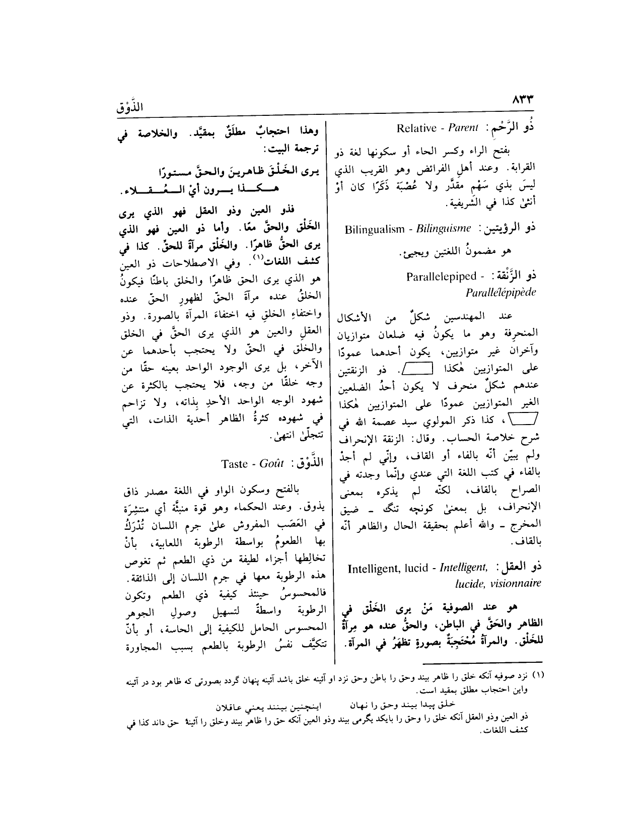 فذو العين وذو العقل فهو الذي يرى الخلق والحقّ معا. وأما ذو العين فهو الذي يرى الحقّ ظاهرا. والخلق مرآة للحقّ. كذا في كشف اللغات «1». وفي الاصطلاحات ذو العين هو الذي يرى الحق ظاهرا والخلق باطنا فيكون الخلق عنده مرآة الحقّ لظهور الحقّ عنده واختفاء الخلق فيه اختفاء المرآة بالصورة. وذو العقل والعين هو الذي يرى الحقّ في الخلق والخلق في الحقّ ولا يحتجب بأحدهما عن الآخر، بل يرى الوجود الواحد بعينه حقا من وجه خلقا من وجه، فلا يحتجب بالكثرة عن شهود الوجه الواحد الأحد بذاته، ولا تزاحم في شهوده كثرة الظاهر أحدية الذات، التي تتجلّى انتهى.