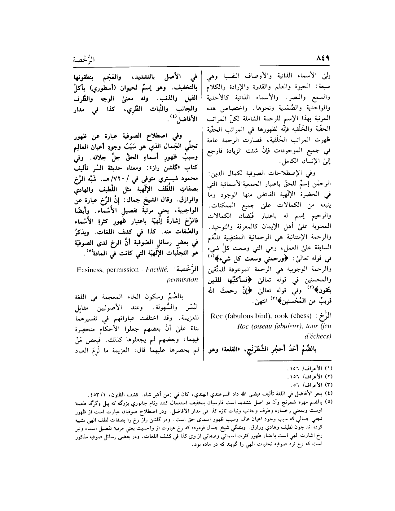 (5) بالضم مهره شطرنج وآن در اصل بتشديد است فارسيان بتخفيف استعمال كنند ونام جانوري بزرگ كه پيل وگرگ طعمه اوست وبمعني رخساره وطرف وجانب ونبات تازه كذا في مدار الافاضل. ودر اصطلاح صوفيان عبارت است از ظهور تجلي جمالي كه سبب وجود اعيان عالم وسبب ظهور اسماى حق است. ودر گلشن راز رخ را بصفات لطف إلهي تشبيه كرده اند چون لطيف وهادي ورازق. وبندگي شيخ جمال فرموده كه رخ عبارت از واحديت يعني مرتبه تفصيل اسماء ونيز رخ اشارت إلهي است باعتبار ظهور كثرت اسمائي وصفاتي از وى كذا في كشف اللغات. ودر بعضى رسائل صوفيه مذكور است كه رخ نزد صوفيه تجليات إلهي را گويند كه در ماده بود.