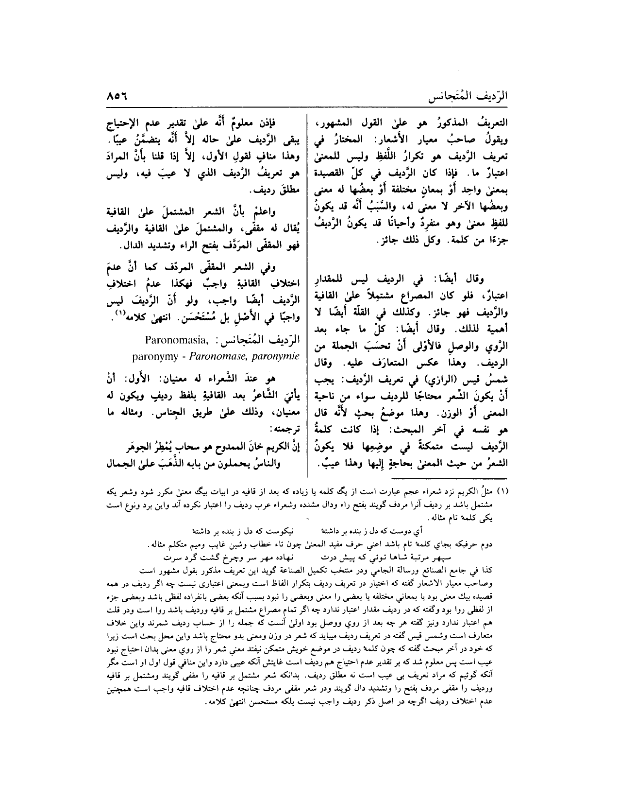 (1) مثل الكريم نزد شعراء عجم عبارت است از يك كلمه يا زياده كه بعد از قافيه در ابيات بيگ معنى مكرر شود وشعرى كه مشتمل باشد بر رديف آن را مردف گويند بفتح راء ودال مشدده وشعراء عرب رديف را اعتبار نكرده اند واين بر دو نوع است يكى كلمه تام مثاله.