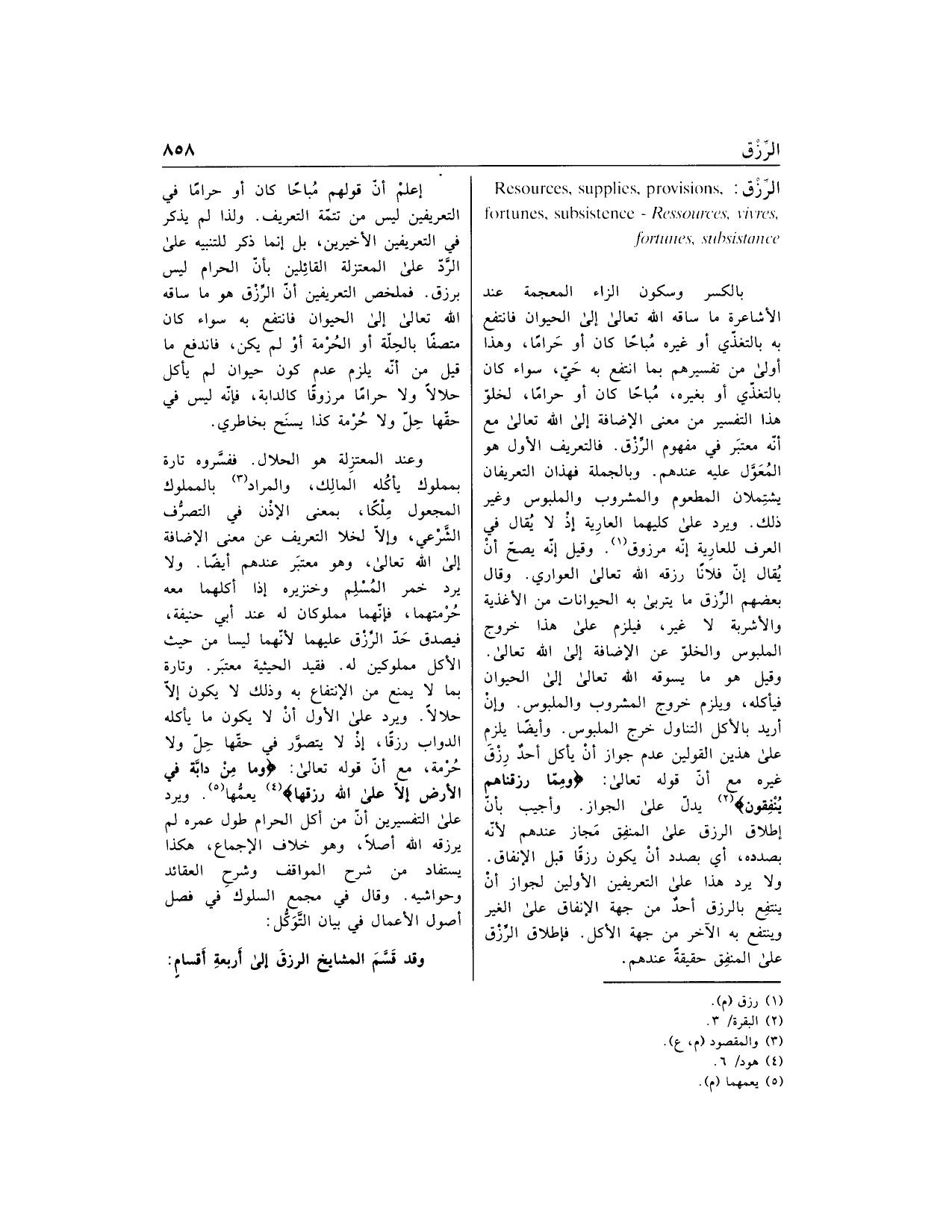 بالكسر وسكون الزاء المعجمة عند الأشاعرة ما ساقه الله تعالى إلى الحيوان فانتفع به بالتغذّي أو غيره مباحا كان أو حراما، وهذا أولى من تفسيرهم بما انتفع به حيّ، سواء كان بالتغذّي أو بغيره، مباحا كان أو حراما، لخلوّ هذا التفسير من معنى الإضافة إلى الله تعالى مع أنّه معتبر في مفهوم الرّزق. فالتعريف الأول هو المعوّل عليه عندهم. وبالجملة فهذان التعريفان يشتملان المطعوم والمشروب والملبوس وغير ذلك. ويرد على كليهما العارية إذ لا يقال في العرف للعارية إنّه مرزوق «1». وقيل إنّه يصحّ أن يقال إنّ فلانا رزقه الله تعالى العواري. وقال بعضهم الرّزق ما يتربى به الحيوانات من الأغذية والأشربة لا غير، فيلزم على هذا خروج الملبوس والخلوّ عن الإضافة إلى الله تعالى.