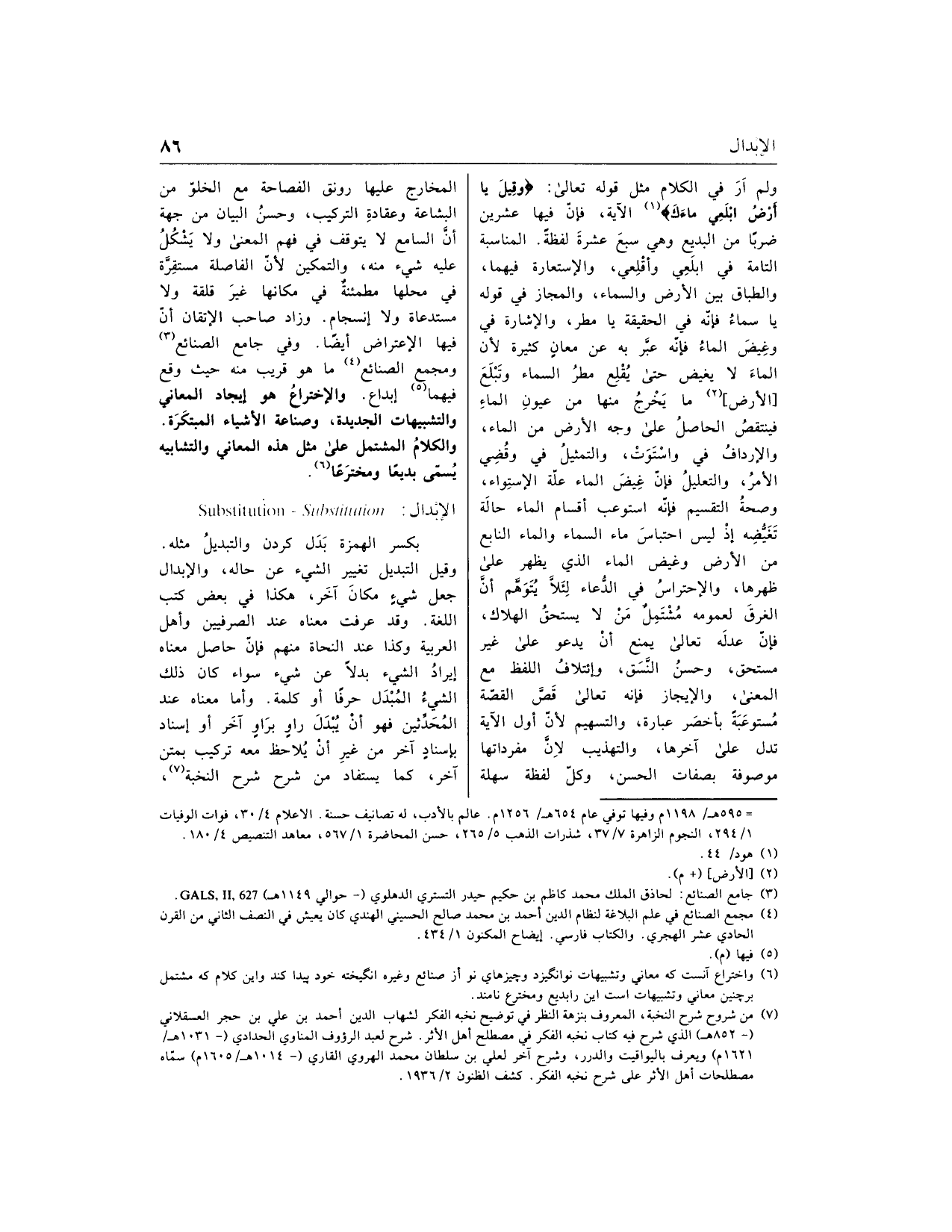 (4) مجمع الصنائع في علم البلاغة لنظام الدين أحمد بن محمد صالح الحسيني الهندي كان يعيش في النصف الثاني من القرن الحادي عشر الهجري. والكتاب فارسي. إيضاح المكنون 1/ 434.