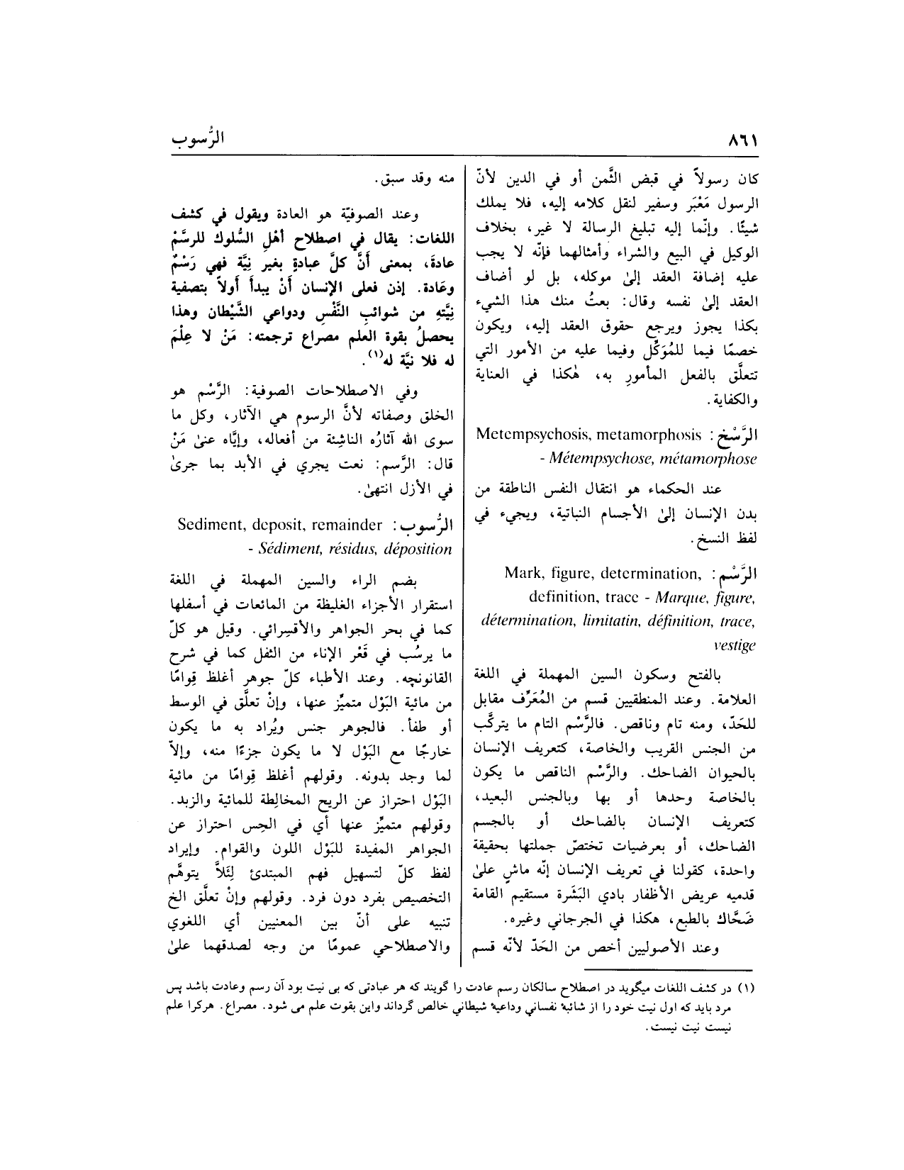 وعند الصوفيّة هو العادة ويقول في كشف اللغات: يقال في اصطلاح أهل السّلوك للرّسم عادة، بمعنى أنّ كلّ عبادة بغير نيّة فهي رسم وعادة. إذن فعلى الإنسان أن يبدأ أولا بتصفية نيّته من شوائب النّفس ودواعي الشّيطان وهذا يحصل بقوة العلم مصراع ترجمته: من لا علم له فلا نيّة له «1».