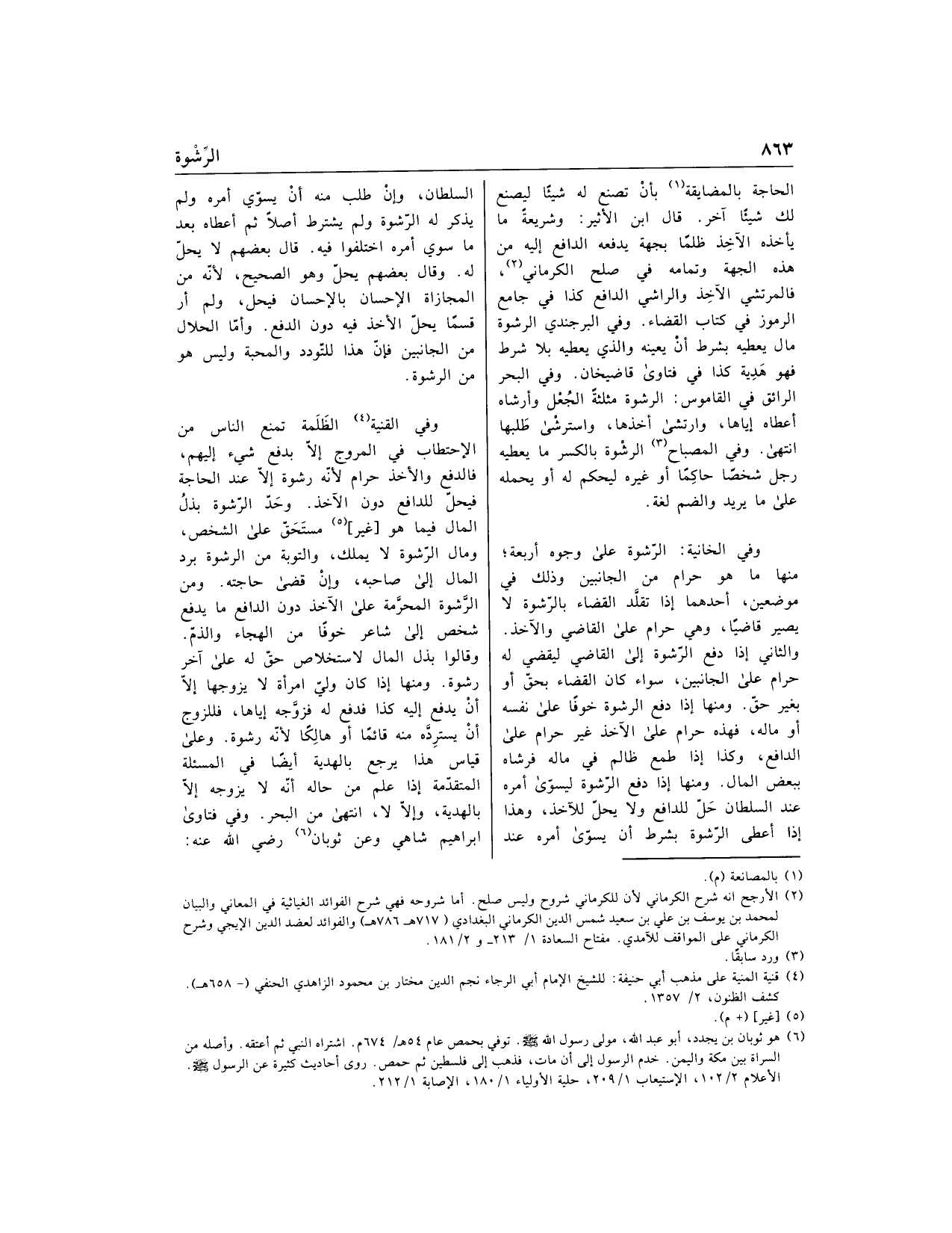 وفي القنية «4» الظلمة تمنع الناس من الاحتطاب في المروج إلّا بدفع شيء إليهم، فالدفع والأخذ حرام لأنّه رشوة إلّا عند الحاجة فيحلّ للدافع دون الآخذ. وحدّ الرّشوة بذل المال فيما هو [غير] «5» مستحقّ على الشخص، ومال الرّشوة لا يملك، والتوبة من الرشوة برد المال إلى صاحبه، وإن قضى حاجته. ومن الرّشوة المحرّمة على الآخذ دون الدافع ما يدفع شخص إلى شاعر خوفا من الهجاء والذمّ.
