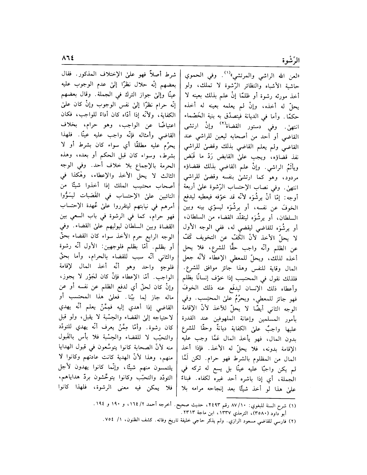 «لعن الله الراشي والمرتشي» «1». وفي الحموي حاشية الأشباه والنظائر الرّشوة لا تملك، ولو أخذ مورثه رشوة أو ظلما إن علم بذلك بعينه لا يحلّ له أخذه، وإن لم يعلمه بعينه له أخذه حكما. وأما في الديانة فيتصدّق به بنية الخصماء انتهى. وفي دستور القضاة «2» وإن ارتشى القاضي أو أحد من أصحابه ليعين للراشي عند القاضي ولم يعلم القاضي بذلك وقضى للراشي نفذ قضاؤه، ويجب على القابض ردّ ما قبض ويأثم الراشي. وإن علم القاضي بذلك فقضاؤه مردود، وهو كما ارتشى بنفسه وقضى للراشي انتهى. وفي نصاب الاحتساب الرّشوة على أربعة أوجه: إمّا أن يرشوه لأنّه قد خوّفه فيعطيه ليدفع الخوف عن نفسه، أو يرشوه ليسوّي بينه وبين السلطان، أو يرشوه ليتقلّد القضاء من السلطان، أو يرشوه للقاضي ليقضي له، ففي الوجه الأول لا يحلّ الأخذ لأنّ الكفّ عن التخويف كفّ عن الظلم وأنّه واجب حقّا للشرع، فلا يحل أخذه لذلك، ويحلّ للمعطي الإعطاء لأنّه جعل المال وقاية للنفس وهذا جائز موافق للشرع.