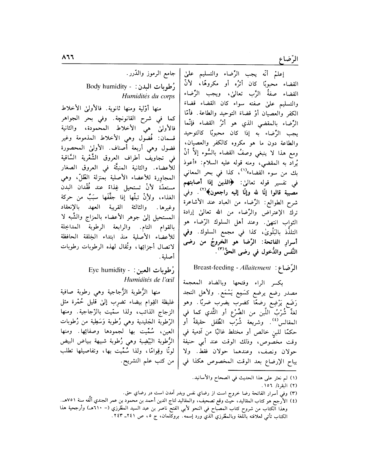 اعلم أنّه يجب الرّضاء والتسليم على القضاء محبوبا كان أثره أو مكروها، لأنّ القضاء صفة الرّب تعالى، ويجب الرّضاء والتسليم على صفته سواء كان القضاء قضاء الكفر والعصيان أو قضاء التوحيد والطاعة. فأمّا الرّضاء بالمقضي الذي هو أثر القضاء فإنّما يجب الرّضاء به إذا كان محبوبا كالتوحيد والطاعة دون ما هو مكروه كالكفر والعصيان، ومع هذا لا ينبغي وصف القضاء بالسّوء إلّا أن يراد به المقضي، ومنه قوله عليه السلام: «أعوذ بك من سوء القضاء» «1»، كذا في بحر المعاني في تفسير قوله تعالى: الَّذِينَ إِذا أَصابَتْهُمْ مُصِيبَةٌ قالُوا إِنَّا لِلَّهِ وَإِنَّا إِلَيْهِ راجِعُونَ «2». وفي شرح الطوالع: الرّضاء من العباد عند الأشاعرة ترك الاعتراض والرّضاء من الله تعالى إرادة الثواب انتهى. وعند أهل السلوك الرّضاء هو التلذّذ بالبلوى، كذا في مجمع السلوك. وفي أسرار الفاتحة: الرّضا هو الخروج من رضى النّفس والدّخول في رضى الحقّ «3».