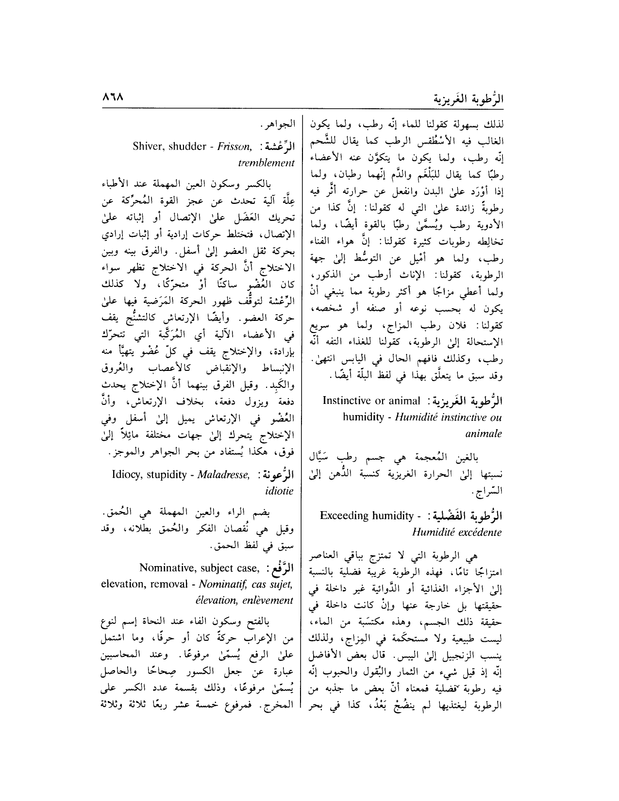 لذلك بسهولة كقولنا للماء إنّه رطب، ولما يكون الغالب فيه الأسطقس الرطب كما يقال للشّحم إنّه رطب، ولما يكون ما يتكوّن عنه الأعضاء رطبا كما يقال للبلغم والدّم إنّهما رطبان، ولما إذا أورد على البدن وانفعل عن حرارته أثّر فيه رطوبة زائدة على التي له كقولنا: إنّ كذا من الأدوية رطب ويسمّى رطبا بالقوة أيضا، ولما تخالطه رطوبات كثيرة كقولنا: إنّ هواء الفناء رطب، ولما هو أميل عن التوسّط إلى جهة الرطوبة، كقولنا: الإناث أرطب من الذكور، ولما أعطي مزاجا هو أكثر رطوبة مما ينبغي أن يكون له بحسب نوعه أو صنفه أو شخصه، كقولنا: فلان رطب المزاج، ولما هو سريع الاستحالة إلى الرطوبة، كقولنا للغذاء التفه أنّه رطب، وكذلك فافهم الحال في اليابس انتهى.