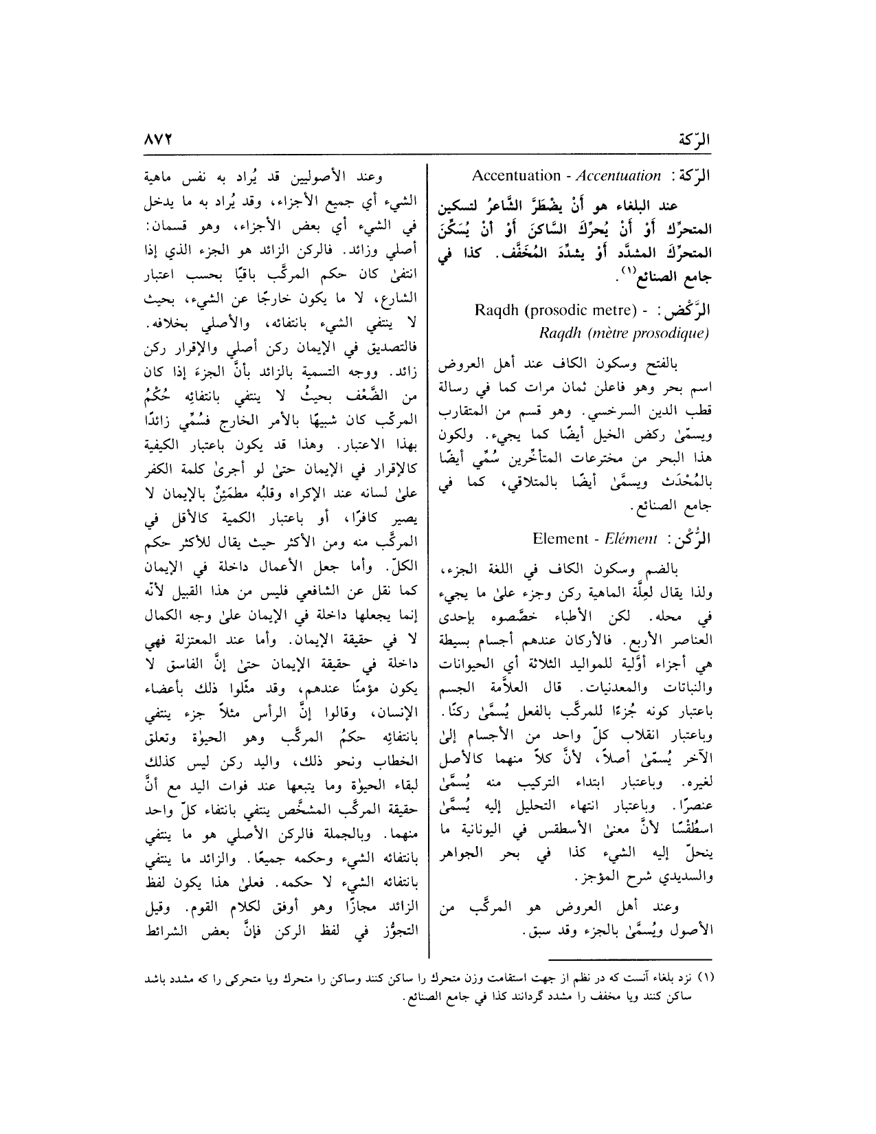 بالضم وسكون الكاف في اللغة الجزء، ولذا يقال لعلّة الماهية ركن وجزء على ما يجيء في محله. لكن الأطباء خصّصوه بإحدى العناصر الأربع. فالأركان عندهم أجسام بسيطة هي أجزاء أوّلية للمواليد الثلاثة أي الحيوانات والنباتات والمعدنيات. قال العلّامة الجسم باعتبار كونه جزءا للمركّب بالفعل يسمّى ركنا.