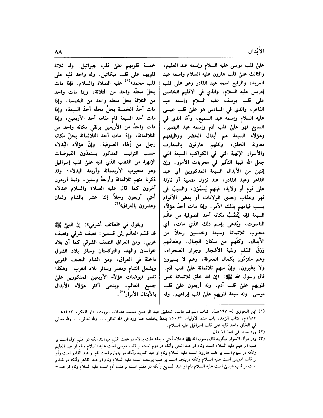(1) ابن الجوزي (- 597 هـ)، كتاب الموضوعات، تحقيق عبد الرحمن محمد عثمان، بيروت، دار الفكر، 1403 هـ- 1983 م، كتاب الزهد، باب عدد الاولياء، 3/ 150 بلفظ يختلف عما ورد في «لله تعالى ... ولله تعالى ... ولله تعالى في الخلق واحد قلبه على قلب اسرافيل عليه السلام