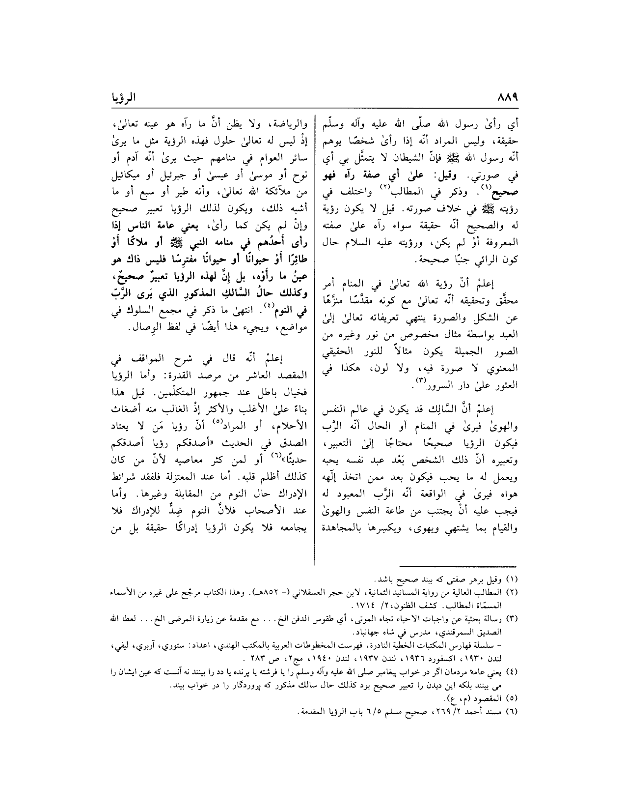 اعلم أنّ رؤية الله تعالى في المنام أمر محقّق وتحقيقه أنّه تعالى مع كونه مقدّسا منزّها عن الشكل والصورة ينتهي تعريفاته تعالى إلى العبد بواسطة مثال مخصوص من نور وغيره من الصور الجميلة يكون مثالا للنور الحقيقي المعنوي لا صورة فيه، ولا لون، هكذا في العثور على دار السرور «3».