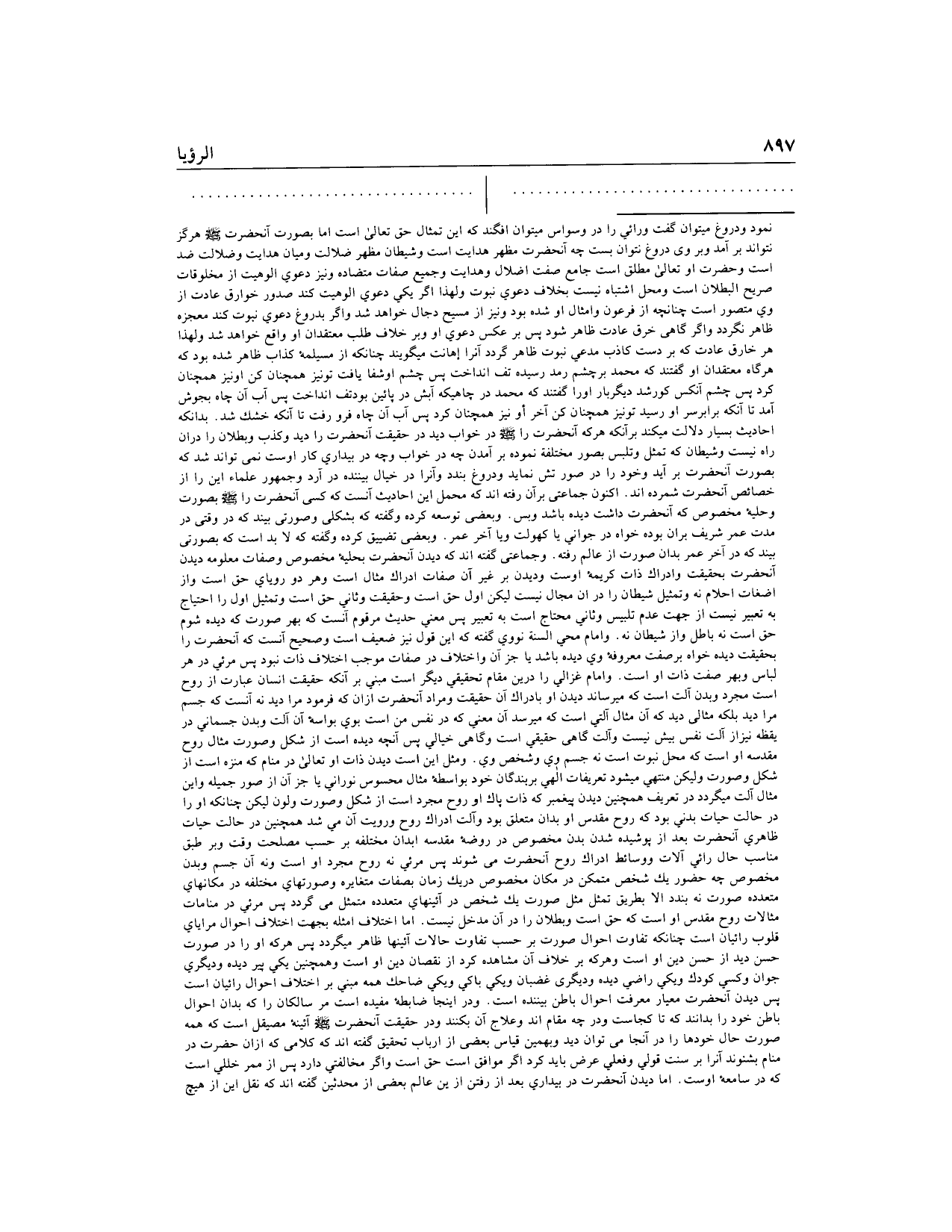 چنانكه از مسيلمه كذاب ظاهر شده بود كه هرگاه معتقدان او گفتند كه محمد بر چشم رمد رسيده تف انداخت پس چشم او شفا يافت تو نيز همچنان كن او نيز همچنان كرد پس چشم آن كس كور شد ديگر بار او را گفتند كه محمد در چاهى كه آبش در پائين بود تف انداخت پس آب آن چاه بجوش آمد تا آنكه برابر سر او رسيد تو نيز همچنان كن آخر او نيز همچنان كرد پس آب آن چاه فرورفت تا آنكه خشك شد. بدان كه احاديث بسيار دلالت مى كند بر آنكه هركه آن حضرت را صلى الله عليه وسلم در خواب ديد در حقيقت آن حضرت را ديد وكذب وبطلان را در آن راه نيست وشيطان كه تمثل وتلبس بصور مختلفة نموده بر آمدن چهـ در خواب وچهـ در بيداري كار اوست نمى تواند شد كه بصورت آن حضرت بر آيد وخود را در صورتش نمايد ودروغ بندد وآن را در خيال بيننده در آرد وجمهور علماء اين را از خصائص آن حضرت شمرده اند. اكنون جماعتى بر آن رفته اند كه محمل اين احاديث آنست كه كسى آن حضرت را صلى الله عليه وسلم بصورت وحليه مخصوص كه آن حضرت داشت ديده باشد وبس.