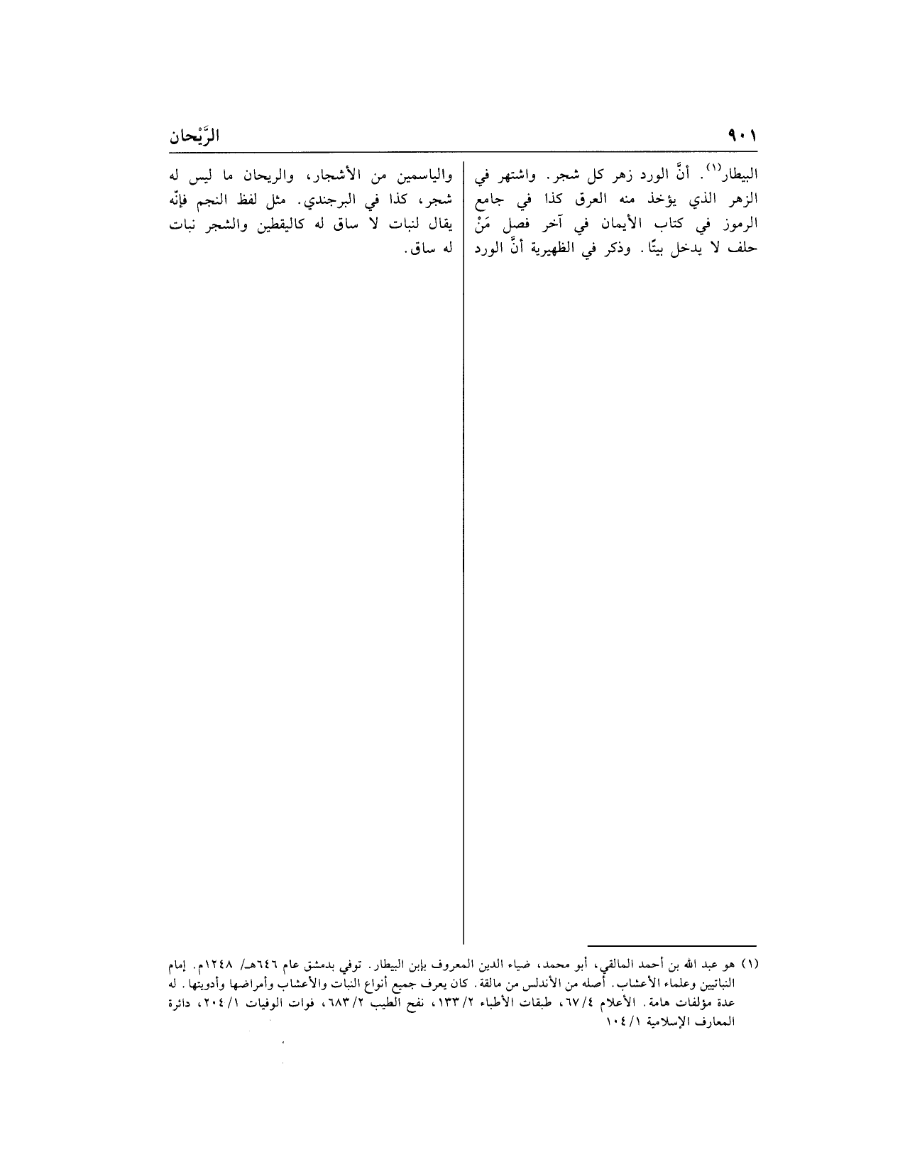 (1) هو عبد الله بن أحمد المالقي، أبو محمد، ضياء الدين المعروف بابن البيطار. توفي بدمشق عام 646 هـ/ 1248 م. إمام النباتيين وعلماء الأعشاب. أصله من الأندلس من مالقة. كان يعرف جميع أنواع النبات والأعشاب وأمراضها وأدويتها. له عدة مؤلفات هامة. الأعلام 4/ 67، طبقات الأطباء 2/ 133، نفح الطيب 2/ 683، فوات الوفيات 1/ 204، دائرة المعارف الإسلامية 1/ 104.