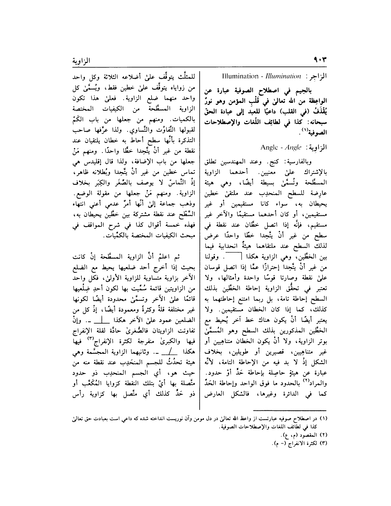 ثم اعلم أنّ الزاوية المسطّحة إن كانت بحيث إذا أخرج أحد ضلعيها يحيط مع الضلع الآخر بزاوية متساوية للزاوية الأولى، فكل واحد من الزاويتين قائمة سمّيت بها لكون أحد ضلعيها قائما على الآخر وتسمّى محدودة أيضا لكونها غير مختلفة قلة وكثرة ومعمودة أيضا، إذ كل من الضلعين عمود على الآخر هكذا-. وإن تفاوتت الزاويتان فالصّغرى حادّة لقلة الانفراج فيها والكبرى منفرجة لكثرة الانفراج «3» فيها هكذا-. وثانيهما الزاوية المجسّمة وهي هيئة تحدث للجسم المنحدب عند نقطة منه من حيث هو، أي الجسم المنحدب ذو حدود متّصلة بها أي بتلك النقطة كزوايا المكعّب أو ذو حدّ كذلك أي متّصل بها كزاوية رأس