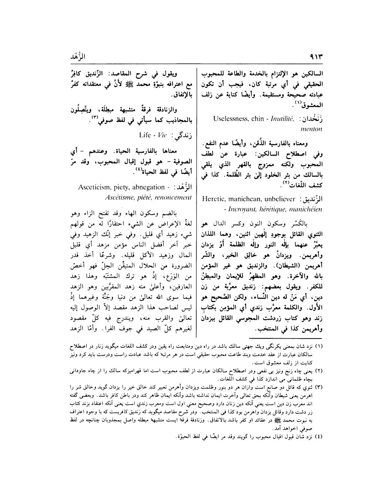 (3) ثنوي كه قائل دو صانع است واز ان هر دو بنور وظلمت ويزدان وأهرمن تعبير كند خالق خير را يزدان گويد وخالق شر را اهرمن يعنى شيطان وآنكه بحق تعالى وآخرت ايمان نداشته باشد وآنكه ايمان ظاهر كند ودر باطن كافر باشد. وبعضى گفته اند معرب زن دين است يعني آنكه دين زنان دارد وصحيح معني اوّل است ومعرب زندي است يعنى آنكه اعتقاد بزند كتاب زردشت دارد وقائل يزدان واهرمن بود كذا في المنتخب. ودر شرح مقاصد ميگويد كه زنديق كافريست كه با وجود اعتراف به نبوت محمد صلى الله عليه وسلم در عقائد او كفر باشد بالاتفاق. وزنادقة فرقه ايست متشبهه مبطله واصل بمجذوبان چنانچهـ در لفظ صوفي خواهد آمد.