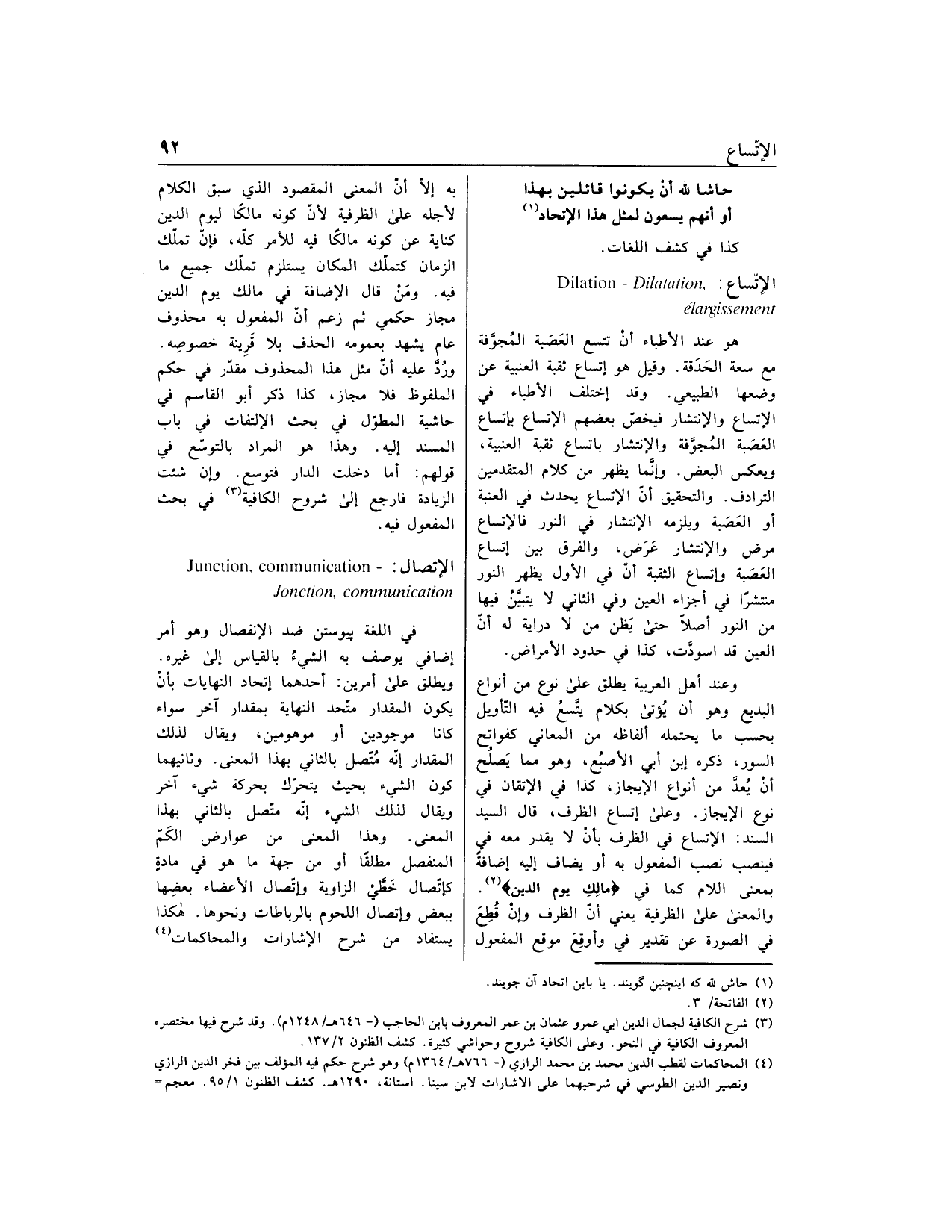وعند أهل العربية يطلق على نوع من أنواع البديع وهو أن يؤتى بكلام يتّسع فيه التّأويل بحسب ما يحتمله ألفاظه من المعاني كفواتح السور، ذكره ابن أبي الأصبع، وهو مما يصلح أن يعدّ من أنواع الإيجاز، كذا في الإتقان في نوع الإيجاز. وعلى اتساع الظرف، قال السيد السند: الاتساع في الظرف بأن لا يقدر معه في فينصب نصب المفعول به أو يضاف إليه إضافة بمعنى اللام كما في مالِكِ يَوْمِ الدِّينِ «2».