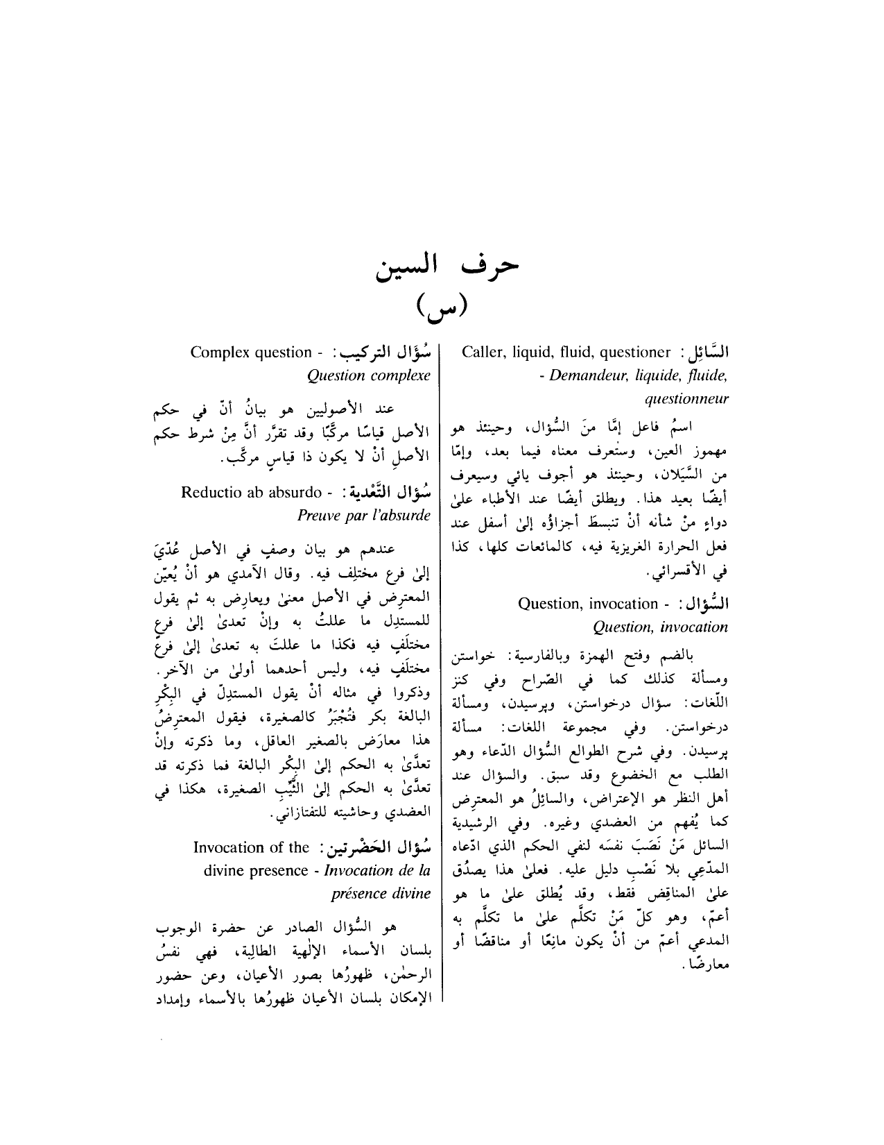 بالضم وفتح الهمزة وبالفارسية: خواستن ومسألة كذلك كما في الصّراح وفي كنز اللّغات: سؤال درخواستن، وپرسيدن، ومسألة درخواستن. وفي مجموعة اللغات: مسألة پرسيدن. وفي شرح الطوالع السّؤال الدّعاء وهو الطلب مع الخضوع وقد سبق. والسؤال عند أهل النظر هو الاعتراض، والسائل هو المعترض كما يفهم من العضدي وغيره. وفي الرشيدية السائل من نصب نفسه لنفي الحكم الذي ادّعاه المدّعي بلا نصب دليل عليه. فعلى هذا يصدق على المناقض فقط، وقد يطلق على ما هو أعمّ، وهو كلّ من تكلّم على ما تكلّم به المدعي أعمّ من أن يكون مانعا أو مناقضا أو معارضا.