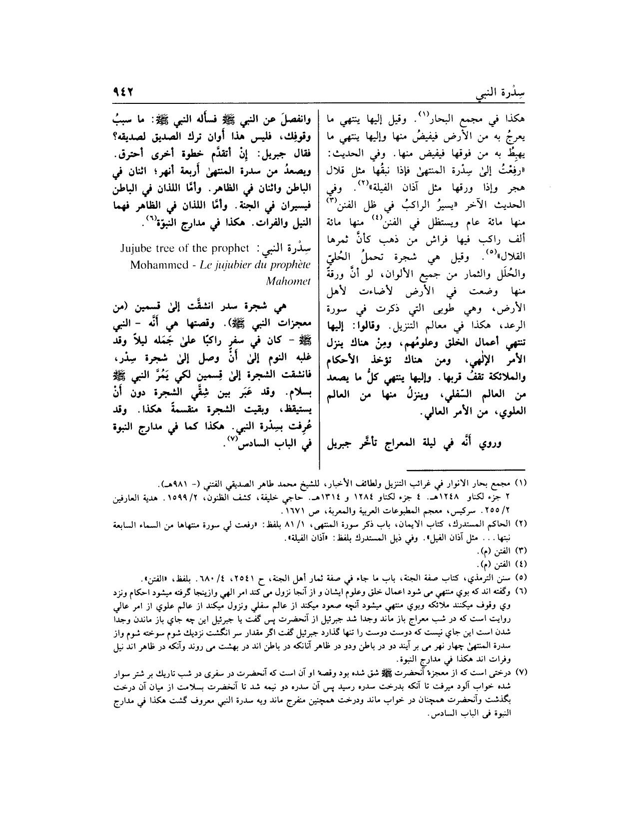 (6) وگفته اند كه بوي منتهي مى شود اعمال خلق وعلوم ايشان واز آنجا نزول مى كند امر إلهي وازينجا گرفته ميشود احكام ونزد وى وقوف ميكنند ملائكه وبوي منتهي ميشود آنچهـ صعود مى كند از عالم سفلي ونزول مى كند از عالم علوي از امر عالي روايت است كه در شب معراج بازماند وجدا شد جبرئيل از آن حضرت پس گفت يا جبرئيل اين چهـ جاي بازماندن وجدا شدن است اين جاي نيست كه دوست دوست را تنها گذارد جبرئيل گفت اگر مقدار سر انگشت نزديك شوم سوخته شوم واز سدرة المنتهى چهار نهر مى برآيند دو در باطن ودو در ظاهر آنان كه در باطن اند در بهشت مى روند وآنكه در ظاهراند نيل وفرات اند هكذا في مدارج النبوة.