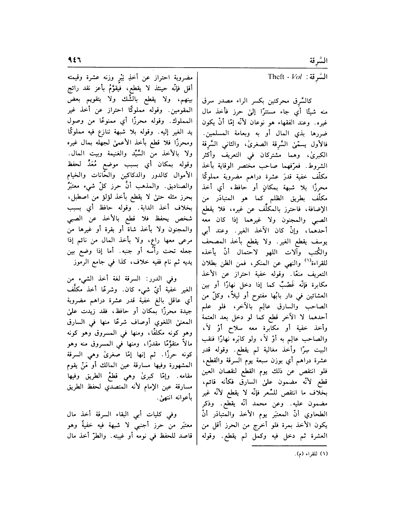فالأول يسمّى السّرقة الصغرى، والثاني السّرقة الكبرى، وهما مشتركان في التعريف وأكثر الشروط. فعرّفهما صاحب مختصر الوقاية بأخذ مكلّف خفية قدر عشرة دراهم مضروبة مملوكا محرزا بلا شبهة بمكان أو حافظ، أي أخذ مكلّف بطريق الظلم كما هو المتبادر من الإضافة، فاحترز بالمكلّف عن غيره، فلا يقطع الصبي والمجنون ولا غيرهما إذا كان معه أحدهما، وإن كان الآخذ الغير. وعند أبي يوسف يقطع الغير. ولا يقطع بأخذ المصحف والكتب وآلات اللهو لاحتمال أن يأخذه للقراءة «1» والنهي عن المنكر، فمن الظن بطلان التعريف منعا. وقوله خفية احتراز عن الأخذ مكابرة فإنّه غصب كما إذا دخل نهارا أو بين العشاءين في دار بابها مفتوح أو ليلا، وكلّ من الصاحب والسارق عالم بالآخر، فلو علم أحدهما لا الآخر قطع كما لو دخل بعد العتمة وأخذ خفية أو مكابرة معه سلاح أو لا، والصاحب عالم به أو لا، ولو كابره نهارا فنقب البيت سرا وأخذ مغالبة لم يقطع. وقوله قدر عشرة دراهم أي بوزن سبعة يوم السرقة والقطع، فلو انتقص عن ذلك يوم القطع لنقصان العين قطع لأنّه مضمون على السارق فكأنه قائم، بخلاف ما انتقص للسّعر فإنّه لا يقطع لأنّه غير مضمون عليه. وعن محمد أنّه يقطع. وذكر الطحاوي أنّ المعتبر يوم الأخذ والمتبادر أن يكون الأخذ بمرة فلو أخرج من الحرز أقل من العشرة ثم دخل فيه وكمل لم يقطع. وقوله مضروبة احتراز عن أخذ تبر وزنه عشرة وقيمته أقل فإنّه حينئذ لا يقطع، فيقوّم بأعز نقد رائج بينهم، ولا يقطع بالشّك ولا بتقويم بعض المقومين. وقوله مملوكا احتراز عن أخذ غير المملوك. وقوله محرزا أي ممنوعا من وصول يد الغير إليه. وقوله بلا شبهة تنازع فيه مملوكا ومحرزا فلا قطع بأخذ الأعمى لجهله بمال غيره ولا بالأخذ من السّيّد والغنيمة وبيت المال.