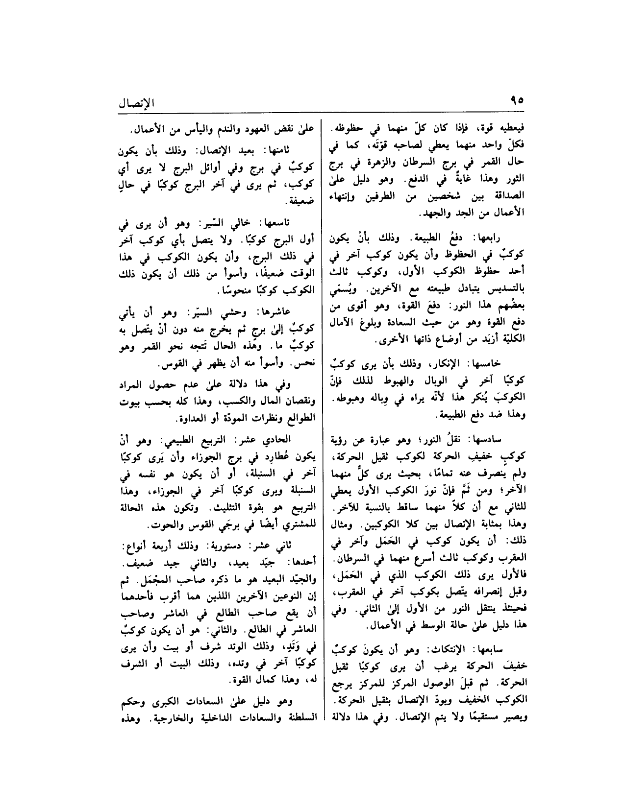 ثامنها: بعيد الاتصال: وذلك بأن يكون كوكب في برج وفي أوائل البرج لا يرى أي كوكب، ثم يرى في آخر البرج كوكبا في حال ضعيفة.