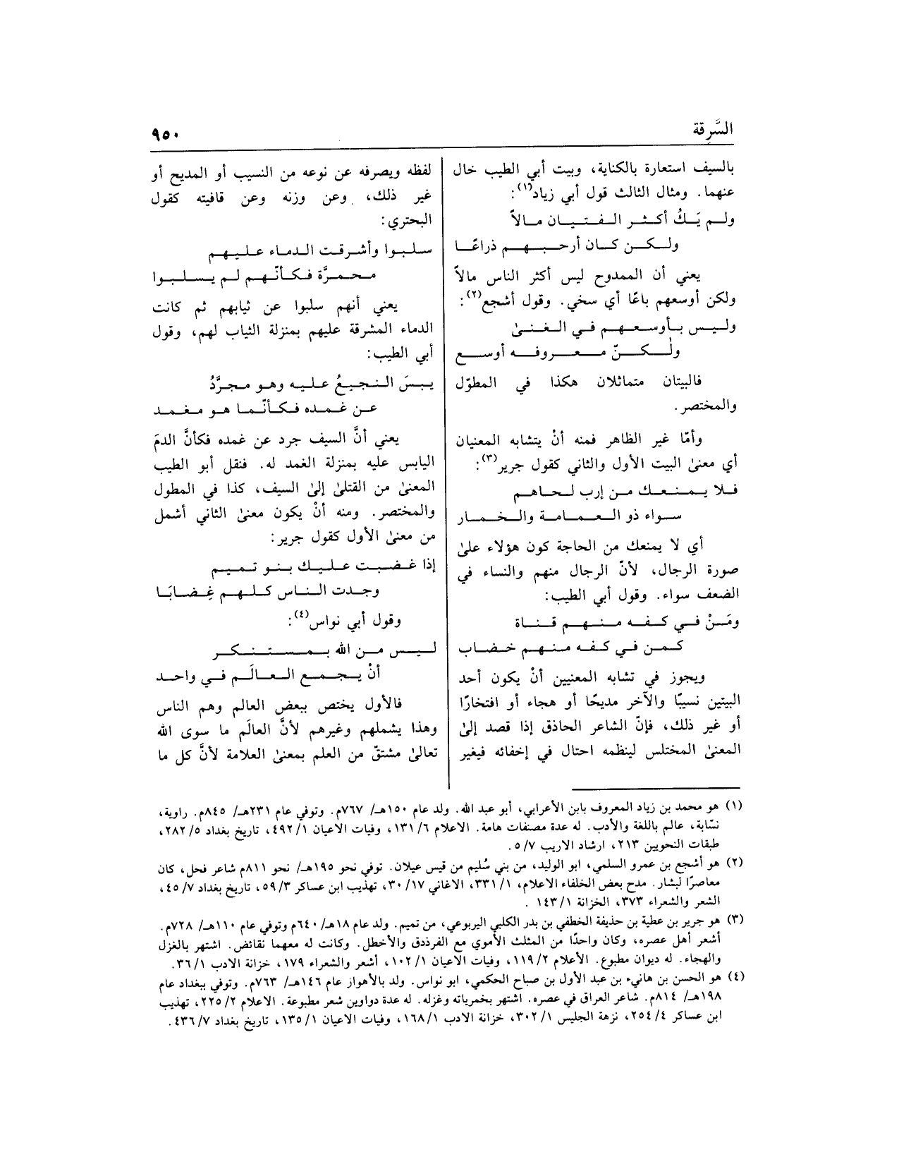 ومن في كفه منهم قناة كمن في كفه منهم خضاب ويجوز في تشابه المعنيين أن يكون أحد البيتين نسيبا والآخر مديحا أو هجاء أو افتخارا أو غير ذلك، فإنّ الشاعر الحاذق إذا قصد إلى المعنى المختلس لينظمه احتال في إخفائه فيغير لفظه ويصرفه عن نوعه من النسيب أو المديح أو غير ذلك، وعن وزنه وعن قافيته كقول البحتري: