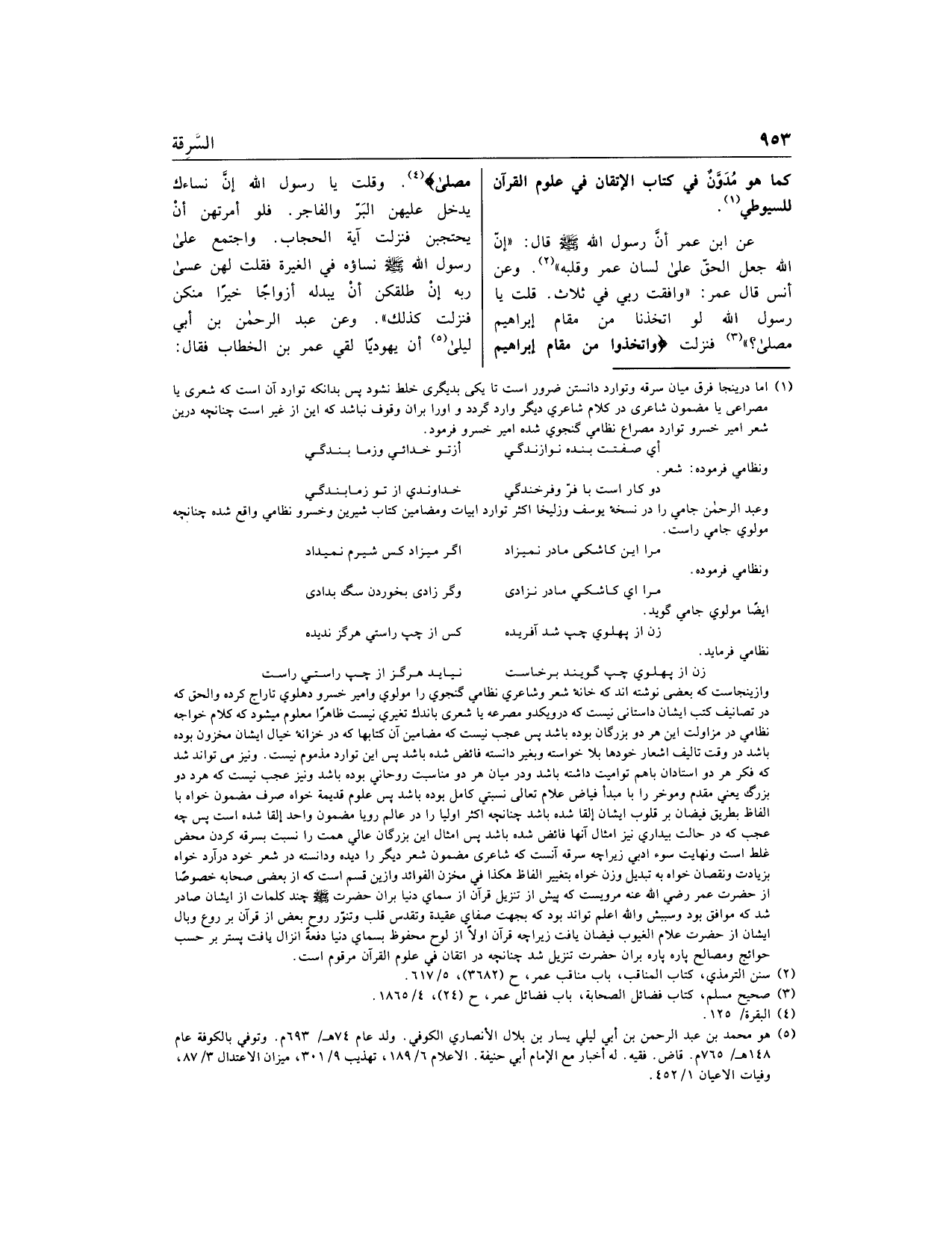 زن از پهلوى چپ گويند برخاست نيايد هرگز از چپ راستى راست وازينجاست كه بعضى نوشته اند كه خانه شعر وشاعري نظامي گنجوى را مولوي وامير خسرو دهلوي تاراج كرده والحق كه در تصانيف كتب ايشان داستانى نيست كه درو يك دو مصرعه يا شعرى به اندك تغيري نيست ظاهرا معلوم ميشود كه كلام خواجه نظامي در مزاولت اين هر دو بزرگان بوده باشد پس عجب نيست كه مضامين آن كتابها كه در خزانه خيال ايشان مخزون بوده باشد در وقت تاليف اشعار خودها بلا خواسته وبغير دانسته فائض شده باشد پس اين توارد مذموم نيست. ونيز مى تواند شد كه فكر هر دو استادان با هم تواميت داشته باشد ودر ميان هر دو مناسبت روحاني بوده باشد ونيز عجب نيست كه هر دو بزرگ يعني مقدم ومؤخر را با مبدأ فياض علام تعالى نسبتي كامل بوده باشد پس علوم قديمة خواه صرف مضمون خواه با الفاظ بطريق فيضان بر قلوب ايشان إلقا شده باشد چنانچهـ اكثر اوليا را در عالم رويا مضمون واحد إلقا شده است پس چهـ عجب كه در حالت بيداري نيز امثال آنها فائض شده باشد پس امثال اين بزرگان عالي همت را نسبت بسرقه كردن محض غلط است ونهايت سوء ادبي زيرا چهـ سرقه آنست كه شاعرى مضمون شعر ديگر را ديده ودانسته در شعر خود درآرد خواه بزيادت ونقصان خواه به تبديل وزن خواه بتغيير الفاظ هكذا في مخزن الفوائد وازين قسم است كه از بعضى صحابه خصوصا از حضرت عمر رضي الله عنه مرويست كه پيش از تنزيل قرآن از سماى دنيا بر ان حضرت صلّى الله عليه وسلم چند كلمات از ايشان صادر شد كه موافق بود وسببش والله اعلم تواند بود كه بجهت صفاى عقيدة وتقدس قلب وتنوّر روح بعض از قرآن بر روع وبال ايشان از حضرت علام الغيوب فيضان يافت زيرا چهـ قرآن أو لا از لوح محفوظ به سماى دنيا دفعة انزال يافت پس تر بر حسب حوائج ومصالح پاره پاره بر ان حضرت تنزيل شد چنانچهـ در اتقان في علوم القرآن مرقوم است.