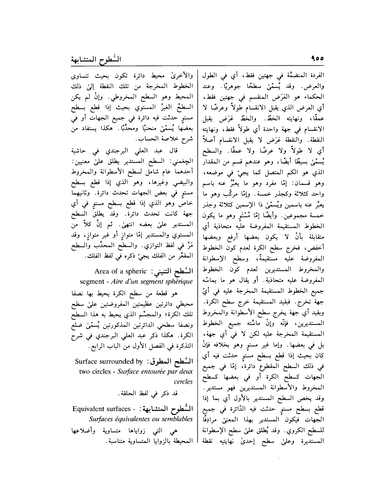 أحدهما عام شامل لسطح الأسطوانة والمخروط والبيضي وغيرها، وهو الذي إذا قطع بسطح مستو في بعض الجهات تحدث دائرة. وثانيهما خاص وهو الذي إذا قطع بسطح مستو في أي جهة كانت تحدث دائرة. وقد يطلق السطح المستدير على بعضه انتهى. ثم إنّ كلا من المستوي والمستدير إمّا متواز أو غير متواز، وقد مرّ في لفظ التوازي. والسطح المحدّب والسطح المقعّر من الفلك يجيء ذكره في لفظ الفلك.