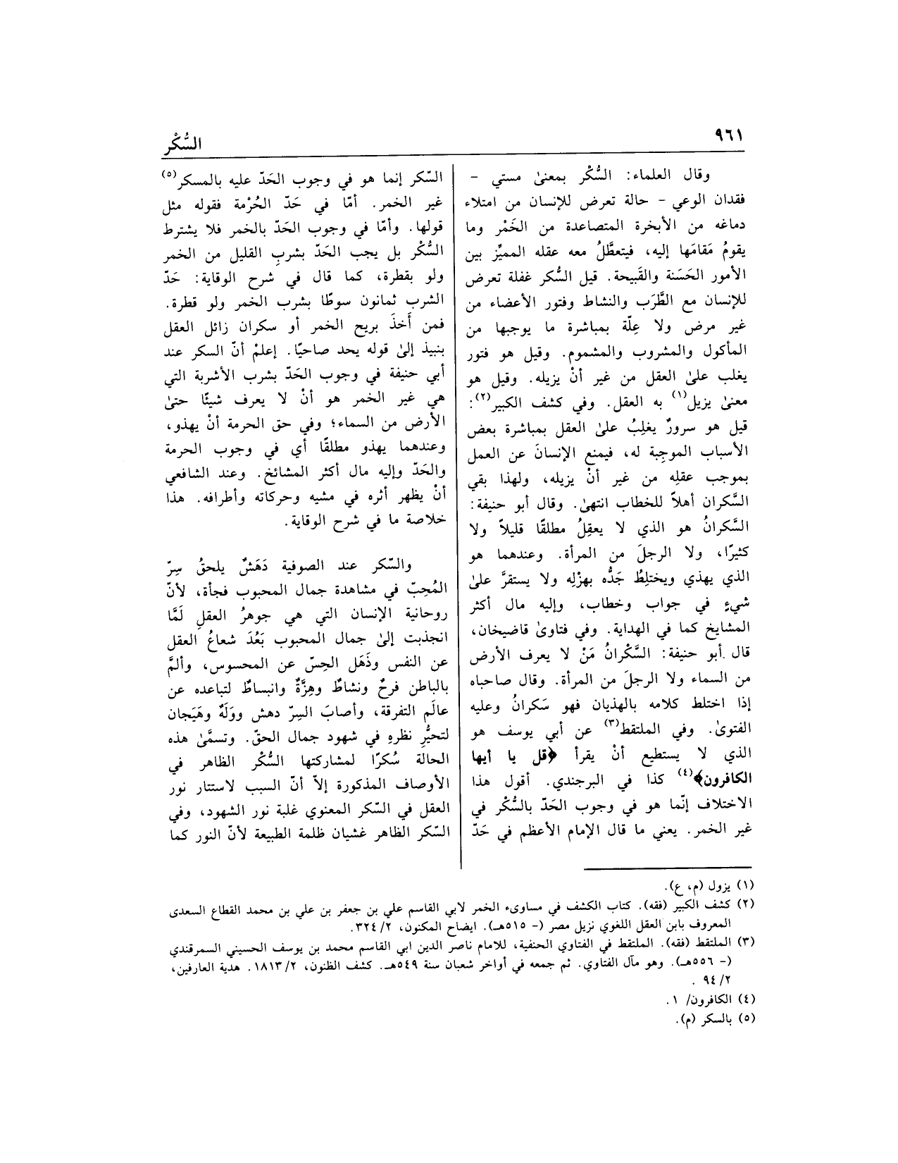 وقال العلماء: السّكر بمعنى مستى- فقدان الوعي- حالة تعرض للإنسان من امتلاء دماغه من الأبخرة المتصاعدة من الخمر وما يقوم مقامها إليه، فيتعطّل معه عقله المميّز بين الأمور الحسنة والقبيحة. قيل السّكر غفلة تعرض للإنسان مع الطّرب والنشاط وفتور الأعضاء من غير مرض ولا علّة بمباشرة ما يوجبها من المأكول والمشروب والمشموم. وقيل هو فتور يغلب على العقل من غير أن يزيله. وقيل هو معنى يزيل «1» به العقل. وفي كشف الكبير «2»: