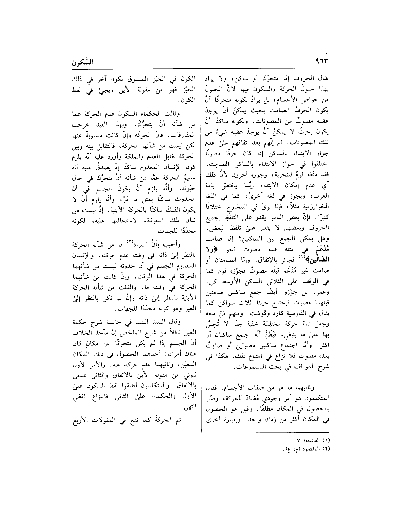 وثانيهما ما هو من صفات الأجسام، فقال المتكلمون هو أمر وجودي مضادّ للحركة، وفسّر بالحصول في المكان مطلقا. وقيل هو الحصول في المكان أكثر من زمان واحد. وبعبارة أخرى الكون في الحيّز المسبوق بكون آخر في ذلك الحيّز فهو من مقولة الأين ويجيء في لفظ الكون.