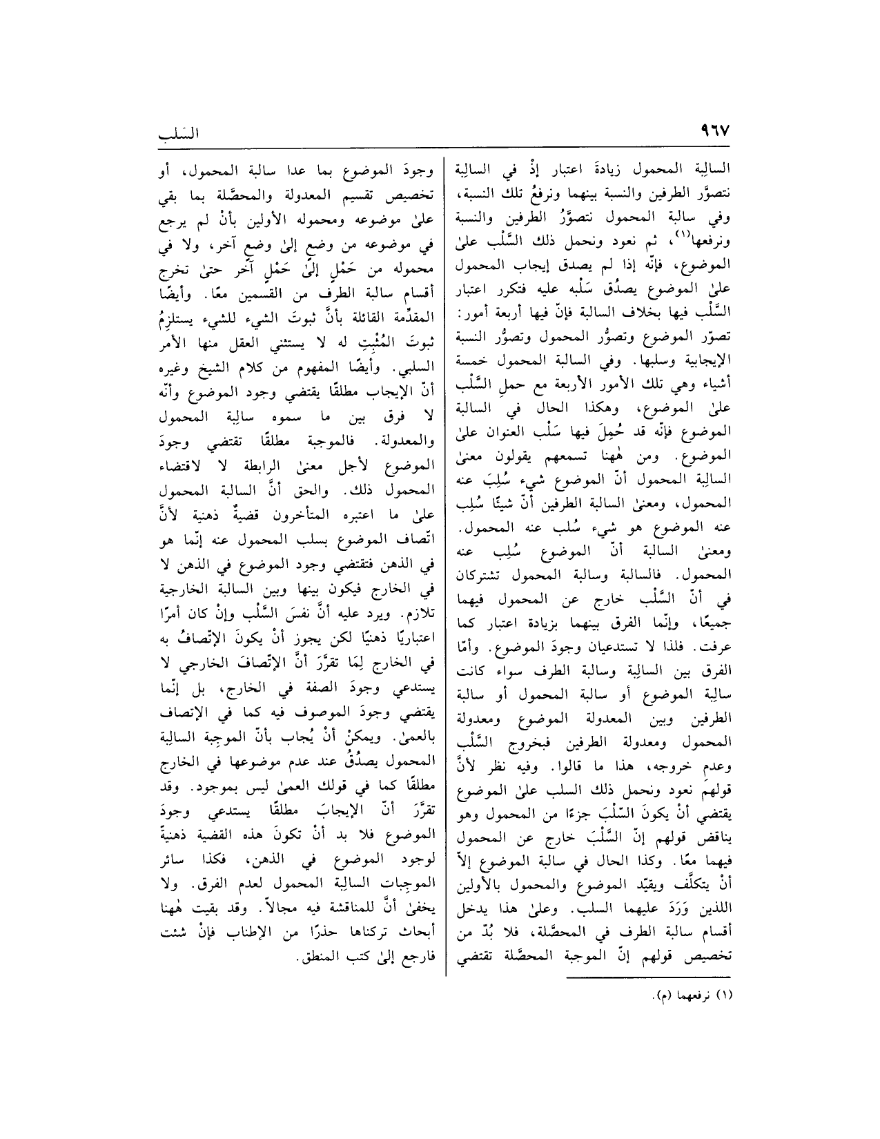 ومعنى السالبة أنّ الموضوع سلب عنه المحمول. فالسالبة وسالبة المحمول تشتركان في أنّ السّلب خارج عن المحمول فيهما جميعا، وإنّما الفرق بينهما بزيادة اعتبار كما عرفت. فلذا لا تستدعيان وجود الموضوع. وأمّا الفرق بين السالبة وسالبة الطرف سواء كانت سالبة الموضوع أو سالبة المحمول أو سالبة الطرفين وبين المعدولة الموضوع ومعدولة المحمول ومعدولة الطرفين فبخروج السّلب وعدم خروجه، هذا ما قالوا. وفيه نظر لأنّ قولهم نعود ونحمل ذلك السلب على الموضوع يقتضي أن يكون السّلب جزءا من المحمول وهو يناقض قولهم إنّ السّلب خارج عن المحمول فيهما معا. وكذا الحال في سالبة الموضوع إلّا أن يتكلّف ويقيّد الموضوع والمحمول بالأولين اللذين ورد عليهما السلب. وعلى هذا يدخل أقسام سالبة الطرف في المحصّلة، فلا بدّ من تخصيص قولهم إنّ الموجبة المحصّلة تقتضي وجود الموضوع بما عدا سالبة المحمول، أو تخصيص تقسيم المعدولة والمحصّلة بما بقي على موضوعه ومحموله الأولين بأن لم يرجع في موضوعه من وضع إلى وضع آخر، ولا في محموله من حمل إلى حمل آخر حتى تخرج أقسام سالبة الطرف من القسمين معا. وأيضا المقدّمة القائلة بأنّ ثبوت الشيء للشيء يستلزم ثبوت المثبت له لا يستثني العقل منها الأمر السلبي. وأيضا المفهوم من كلام الشيخ وغيره أنّ الإيجاب مطلقا يقتضي وجود الموضوع وأنّه لا فرق بين ما سموه سالبة المحمول والمعدولة. فالموجبة مطلقا تقتضي وجود الموضوع لأجل معنى الرابطة لا لاقتضاء المحمول ذلك. والحق أنّ السالبة المحمول على ما اعتبره المتأخرون قضية ذهنية لأنّ اتّصاف الموضوع بسلب المحمول عنه إنّما هو في الذهن فتقتضي وجود الموضوع في الذهن لا في الخارج فيكون بينها وبين السالبة الخارجية تلازم. ويرد عليه أنّ نفس السّلب وإن كان أمرا اعتباريا ذهنيا لكن يجوز أن يكون الاتّصاف به في الخارج لما تقرّر أنّ الاتّصاف الخارجي لا يستدعي وجود الصفة في الخارج، بل إنّما يقتضي وجود الموصوف فيه كما في الاتصاف بالعمى. ويمكن أن يجاب بأنّ الموجبة السالبة المحمول يصدق عند عدم موضوعها في الخارج مطلقا كما في قولك العمى ليس بموجود. وقد تقرّر أنّ الإيجاب مطلقا يستدعي وجود الموضوع فلا بد أن تكون هذه القضية ذهنية لوجود الموضوع في الذهن، فكذا سائر الموجبات السالبة المحمول لعدم الفرق. ولا يخفى أنّ للمناقشة فيه مجالا. وقد بقيت هاهنا أبحاث تركناها حذرا من الإطناب فإن شئت فارجع إلى كتب المنطق.