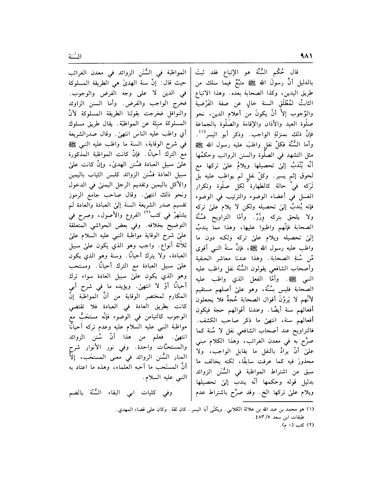 وأما السّنّة فكلّ نفل واظب عليه رسول الله صلّى الله عليه وسلم مثل التشهد في الصلاة والسنن الرواتب وحكمها أنّه يندب إلى تحصيلها ويلام على تركها مع لحوق اثم يسير. وكلّ نفل لم يواظب عليه بل تركه في حالة كالطهارة لكل صلاة وتكرار الغسل في أعضاء الوضوء والترتيب في الوضوء فإنه يندب إلى تحصيله ولكن لا يلام على تركه ولا يلحق بتركه وزر. وأمّا التراويح فسنّة الصحابة فإنّهم واظبوا عليها، وهذا مما يندب إلى تحصيله ويلام على تركه ولكنه دون ما واظب عليه رسول الله صلّى الله عليه وسلم، فإنّ سنة النبي أقوى من سنة الصحابة. وهذا عندنا معاشر الحنفية وأصحاب الشافعي يقولون السّنّة نفل واظب عليه النبي صلّى الله عليه وسلم. وأمّا الفعل الذي واظب عليه الصحابة فليس بسنّة، وهو على أصلهم مستقيم لأنّهم لا يرون أقوال الصحابة حجّة فلا يجعلون أفعالهم سنة أيضا. وعندنا أقوالهم حجة فيكون أفعالهم سنة، انتهى ما ذكر صاحب الكشف.