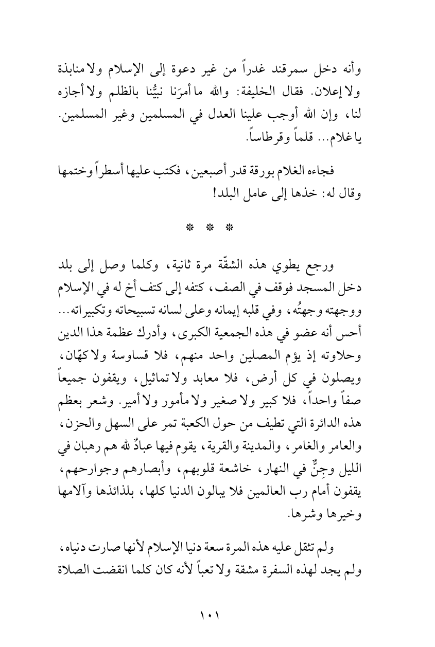 ورجع يطوي هذه الشقّة مرة ثانية، وكلما وصل إلى بلد دخل المسجد فوقف في الصف، كتفه إلى كتف أخ له في الإسلام ووجهته وجهتُه، وفي قلبه إيمانه وعلى لسانه تسبيحاته وتكبيراته ... أحس أنه عضو في هذه الجمعية الكبرى، وأدرك عظمة هذا الدين وحلاوته إذ يؤم المصلين واحد منهم، فلا قساوسة ولا كهّان، ويصلون في كل أرض، فلا معابد ولا تماثيل، ويقفون جميعاً صفاً واحداً، فلا كبير ولا صغير ولا مأمور ولا أمير. وشعر بعظم هذه الدائرة التي تطيف من حول الكعبة تمر على السهل والحزن، والعامر والغامر، والمدينة والقرية، يقوم فيها عبادٌ لله هم رهبان في الليل وجِنٌّ في النهار، خاشعة قلوبهم، وأبصارهم وجوارحهم، يقفون أمام رب العالمين فلا يبالون الدنيا كلها، بلذائذها وآلامها وخيرها وشرها.