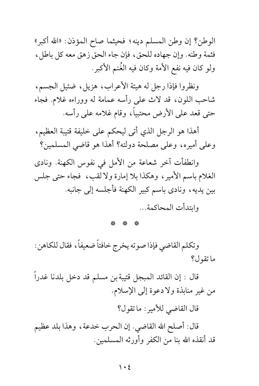الوطن؟ إن وطن المسلم دينه؛ فحيثما صاح المؤذن: «الله أكبر» فثمة وطنه. وإن جهاده للحق، فإن جاء الحق زهق معه كل باطل، ولو كان فيه نفع الأمة وكان فيه الغُنم الأكبر.