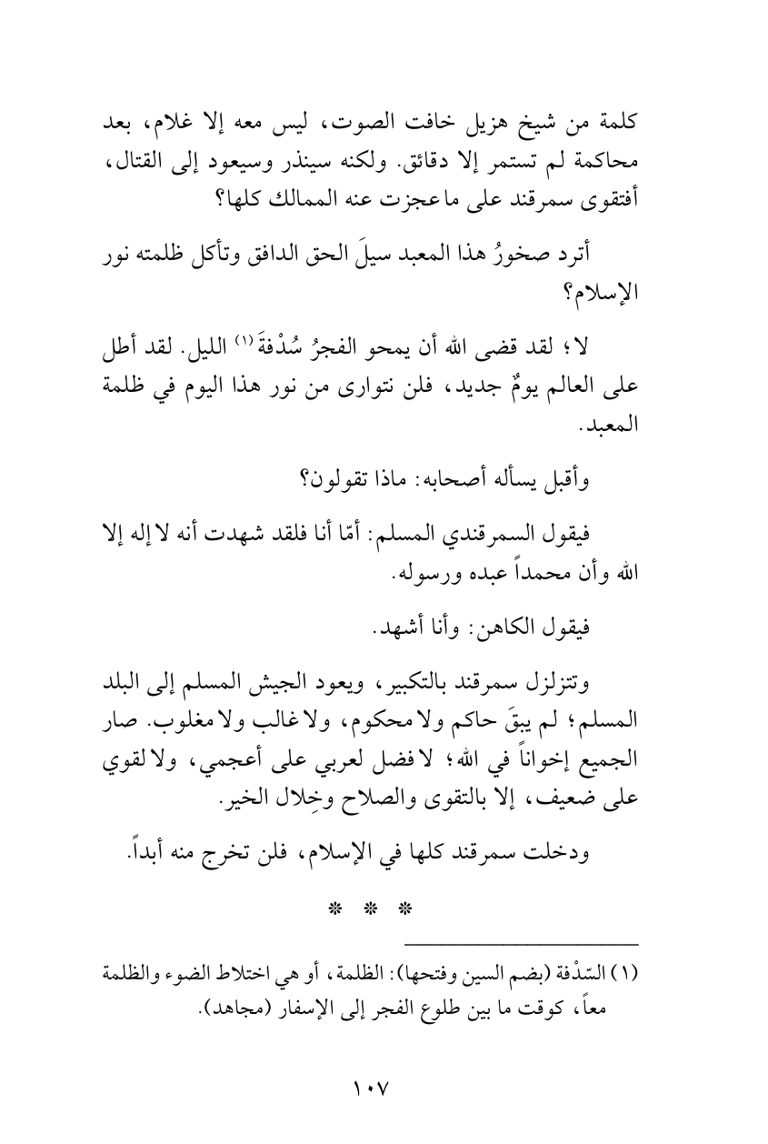 كلمة من شيخ هزيل خافت الصوت، ليس معه إلا غلام، بعد محاكمة لم تستمر إلا دقائق. ولكنه سينذر وسيعود إلى القتال، أفتقوى سمرقند على ما عجزت عنه الممالك كلها؟