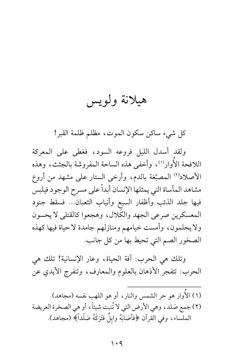 ولقد أسدل الليل فروعه السود، فغطى على المعركة اللافحة الأُوار (¬1)، وأخفى هذه الساحة المفروشة بالجثث، وهذه الأصلاد (¬2) المصبَّغة بالدم، وأرخى الستار على مشهد من أروع مشاهد المأساة التي يمثلها الإنسان أبداً على مسرح الوجود فيلبس فيها جلد الذئب وأظفار السبع وأنياب الثعبان ... فسقط جنود المعسكرين صرعى الجهد والكَلال، وهجعوا كالقتلى لا يحسون ولا يحلمون، وأمست خيامهم ومنازلهم جامدة لا حياة فيها كهذه الصخور الصم التي تحيط بها من كل جانب.