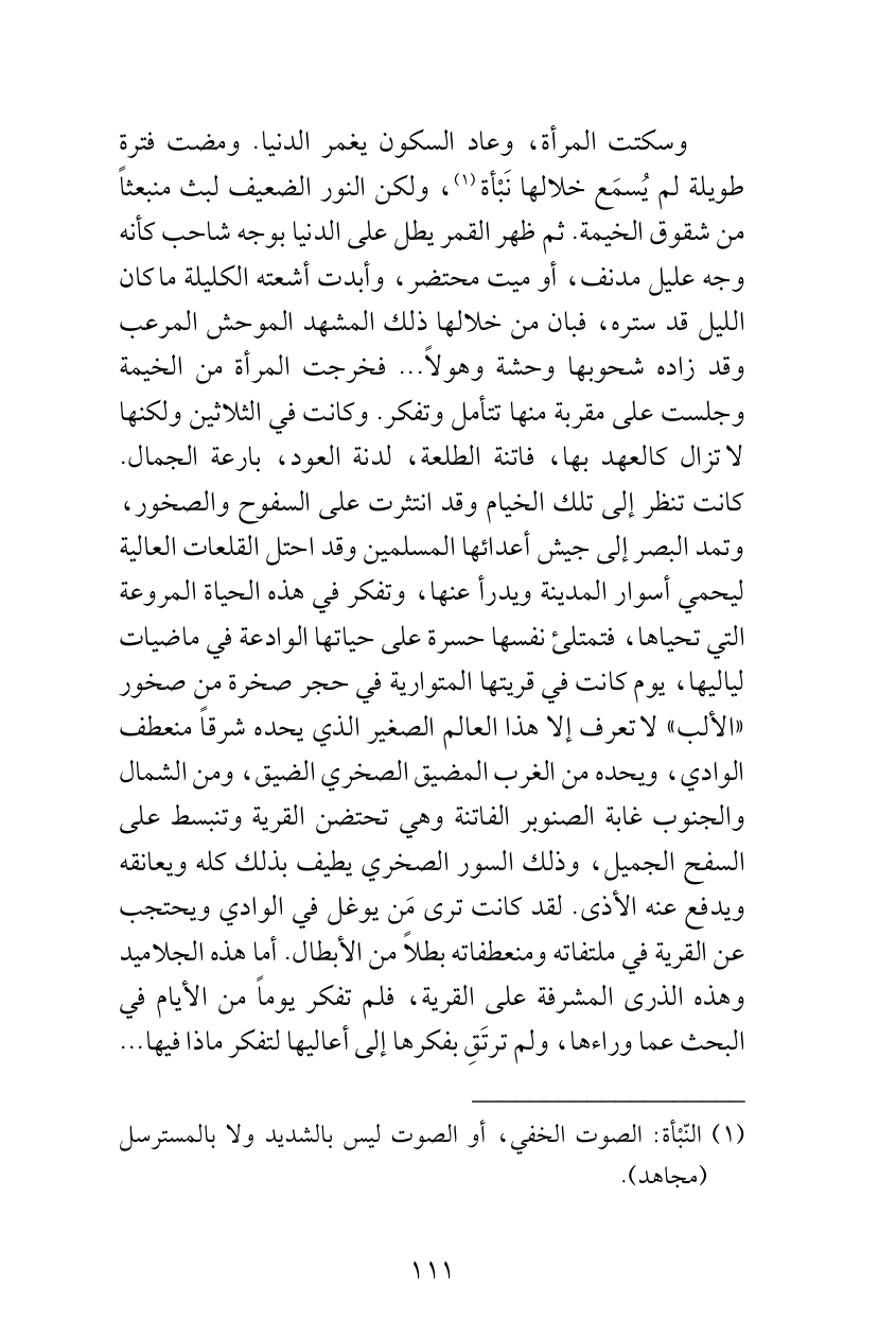 وسكتت المرأة، وعاد السكون يغمر الدنيا. ومضت فترة طويلة لم يُسمَع خلالها نَبْأة (¬1)، ولكن النور الضعيف لبث منبعثاً من شقوق الخيمة. ثم ظهر القمر يطل على الدنيا بوجه شاحب كأنه وجه عليل مدنف، أو ميت محتضر، وأبدت أشعته الكليلة ما كان الليل قد ستره، فبان من خلالها ذلك المشهد الموحش المرعب وقد زاده شحوبها وحشة وهولاً ... فخرجت المرأة من الخيمة وجلست على مقربة منها تتأمل وتفكر. وكانت في الثلاثين ولكنها لا تزال كالعهد بها، فاتنة الطلعة، لدنة العود، بارعة الجمال. كانت تنظر إلى تلك الخيام وقد انتثرت على السفوح والصخور، وتمد البصر إلى جيش أعدائها المسلمين وقد احتل القلعات العالية ليحمي أسوار المدينة ويدرأ عنها، وتفكر في هذه الحياة المروعة التي تحياها، فتمتلئ نفسها حسرة على حياتها الوادعة في ماضيات لياليها، يوم كانت في قريتها المتوارية في حجر صخرة من صخور «الألب» لا تعرف إلا هذا العالم الصغير الذي يحده شرقاً منعطف الوادي، ويحده من الغرب المضيق الصخري الضيق، ومن الشمال والجنوب غابة الصنوبر الفاتنة وهي تحتضن القرية وتنبسط على السفح الجميل، وذلك السور الصخري يطيف بذلك كله ويعانقه ويدفع عنه الأذى. لقد كانت ترى مَن يوغل في الوادي ويحتجب عن القرية في ملتفاته ومنعطفاته بطلاً من الأبطال. أما هذه الجلاميد وهذه الذرى المشرفة على القرية، فلم تفكر يوماً من الأيام في البحث عما وراءها، ولم ترتَقِ بفكرها إلى أعاليها لتفكر ماذا فيها ...