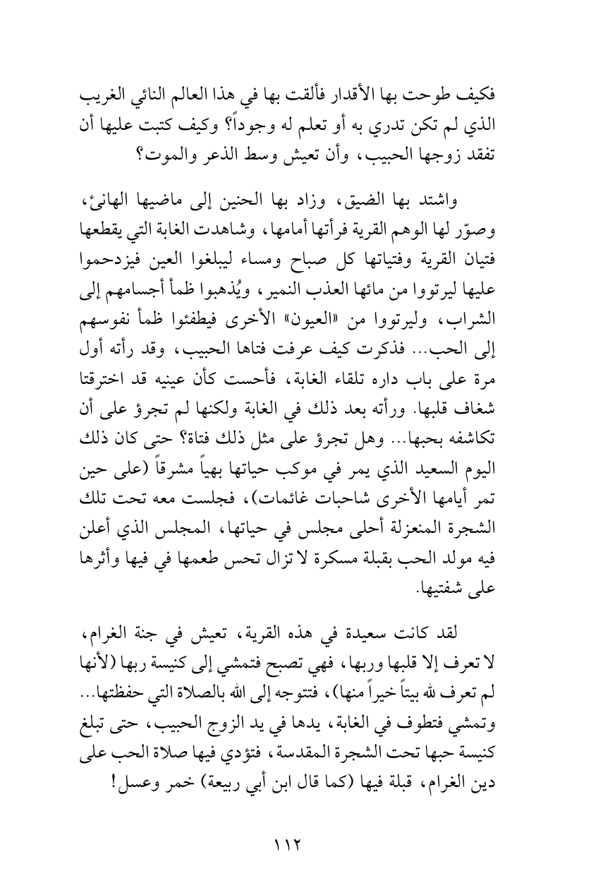 واشتد بها الضيق، وزاد بها الحنين إلى ماضيها الهانئ، وصوّر لها الوهم القرية فرأتها أمامها، وشاهدت الغابة التي يقطعها فتيان القرية وفتياتها كل صباح ومساء ليبلغوا العين فيزدحموا عليها ليرتووا من مائها العذب النمير، ويُذهبوا ظمأ أجسامهم إلى الشراب، وليرتووا من «العيون» الأخرى فيطفئوا ظمأ نفوسهم إلى الحب ... فذكرت كيف عرفت فتاها الحبيب، وقد رأته أول مرة على باب داره تلقاء الغابة، فأحست كأن عينيه قد اخترقتا شغاف قلبها. ورأته بعد ذلك في الغابة ولكنها لم تجرؤ على أن تكاشفه بحبها ... وهل تجرؤ على مثل ذلك فتاة؟ حتى كان ذلك اليوم السعيد الذي يمر في موكب حياتها بهياً مشرقاً (على حين تمر أيامها الأخرى شاحبات غائمات)، فجلست معه تحت تلك الشجرة المنعزلة أحلى مجلس في حياتها، المجلس الذي أعلن فيه مولد الحب بقبلة مسكرة لا تزال تحس طعمها في فيها وأثرها على شفتيها.