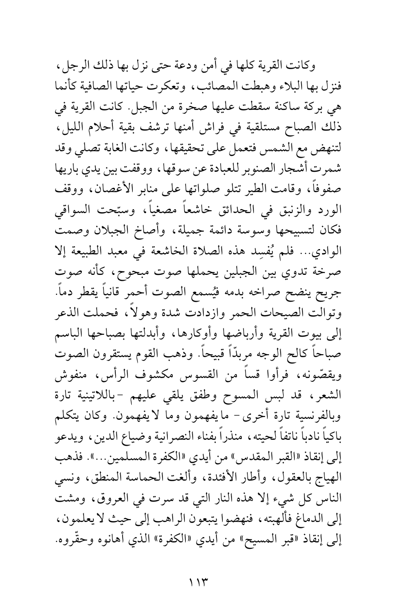 وكانت القرية كلها في أمن ودعة حتى نزل بها ذلك الرجل، فنزل بها البلاء وهبطت المصائب، وتعكرت حياتها الصافية كأنما هي بركة ساكنة سقطت عليها صخرة من الجبل. كانت القرية في ذلك الصباح مستلقية في فراش أمنها ترشف بقية أحلام الليل، لتنهض مع الشمس فتعمل على تحقيقها، وكانت الغابة تصلي وقد شمرت أشجار الصنوبر للعبادة عن سوقها، ووقفت بين يدي باريها صفوفاً، وقامت الطير تتلو صلواتها على منابر الأغصان، ووقف الورد والزنبق في الحدائق خاشعاً مصغياً، وسبّحت السواقي فكان لتسبيحها وسوسة دائمة جميلة، وأصاخ الجبلان وصمت الوادي ... فلم يُفسِد هذه الصلاة الخاشعة في معبد الطبيعة إلا صرخة تدوي بين الجبلين يحملها صوت مبحوح، كأنه صوت جريح ينضح صراخه بدمه فيُسمع الصوت أحمر قانياً يقطر دماً. وتوالت الصيحات الحمر وازدادت شدة وهولاً، فحملت الذعر إلى بيوت القرية وأرباضها وأوكارها، وأبدلتها بصباحها الباسم صباحاً كالح الوجه مربدّاً قبيحاً. وذهب القوم يستقرون الصوت ويقصّونه، فرأوا قساً من القسوس مكشوف الرأس، منفوش الشعر، قد لبس المسوح وطفق يلقي عليهم - باللاتينية تارة وبالفرنسية تارة أخرى - ما يفهمون وما لا يفهمون. وكان يتكلم باكياً نادباً ناتفاً لحيته، منذراً بفناء النصرانية وضياع الدين، ويدعو إلى إنقاذ «القبر المقدس» من أيدي «الكفرة المسلمين ...». فذهب الهياج بالعقول، وأطار الأفئدة، وألغت الحماسة المنطق، ونسي الناس كل شيء إلا هذه النار التي قد سرت في العروق، ومشت إلى الدماغ فألهبته، فنهضوا يتبعون الراهب إلى حيث لا يعلمون، إلى إنقاذ «قبر المسيح» من أيدي «الكفرة» الذي أهانوه وحقّروه.