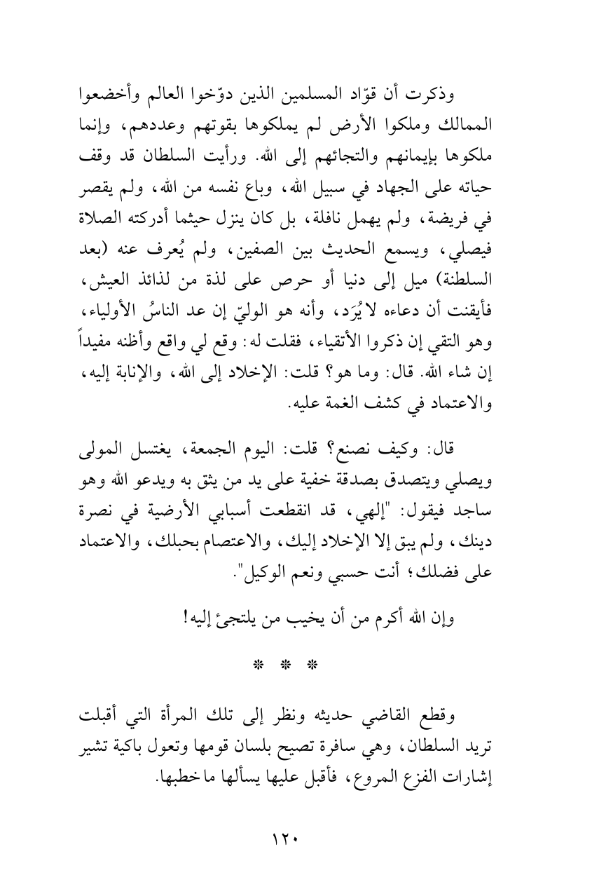 وذكرت أن قوّاد المسلمين الذين دوّخوا العالم وأخضعوا الممالك وملكوا الأرض لم يملكوها بقوتهم وعددهم، وإنما ملكوها بإيمانهم والتجائهم إلى الله. ورأيت السلطان قد وقف حياته على الجهاد في سبيل الله، وباع نفسه من الله، ولم يقصر في فريضة، ولم يهمل نافلة، بل كان ينزل حيثما أدركته الصلاة فيصلي، ويسمع الحديث بين الصفين، ولم يُعرف عنه (بعد السلطنة) ميل إلى دنيا أو حرص على لذة من لذائذ العيش، فأيقنت أن دعاءه لا يُرَد، وأنه هو الوليّ إن عد الناسُ الأولياء، وهو التقي إن ذكروا الأتقياء، فقلت له: وقع لي واقع وأظنه مفيداً إن شاء الله. قال: وما هو؟ قلت: الإخلاد إلى الله، والإنابة إليه، والاعتماد في كشف الغمة عليه.